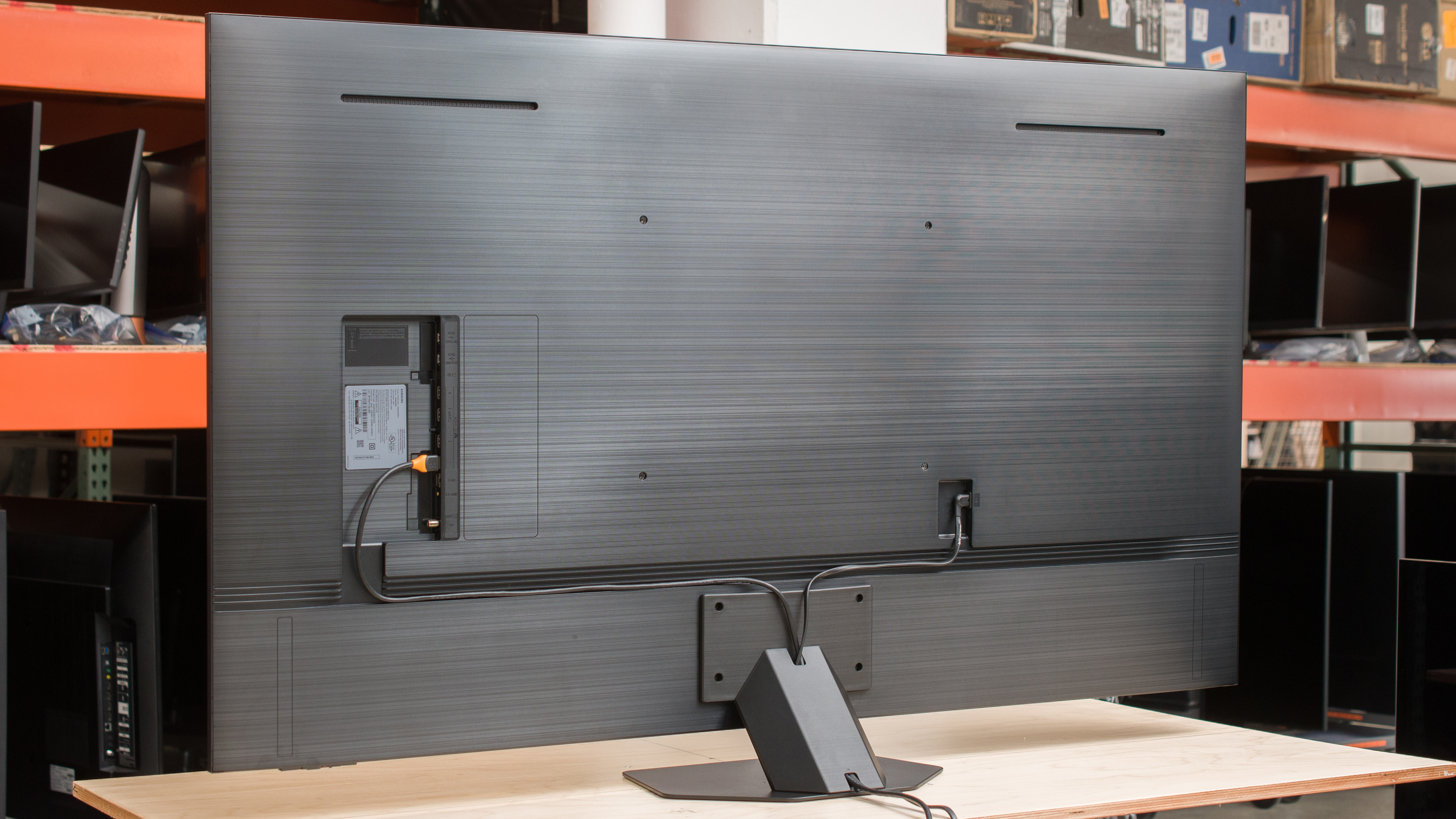 The back is plastic with a textured brushed metal finish. There are channels along the back and a space in the stand for basic cable management. Unfortunately, the inputs are inset into the back of the TV, so they're difficult to access if you wall-mount the TV with a fixed bracket.