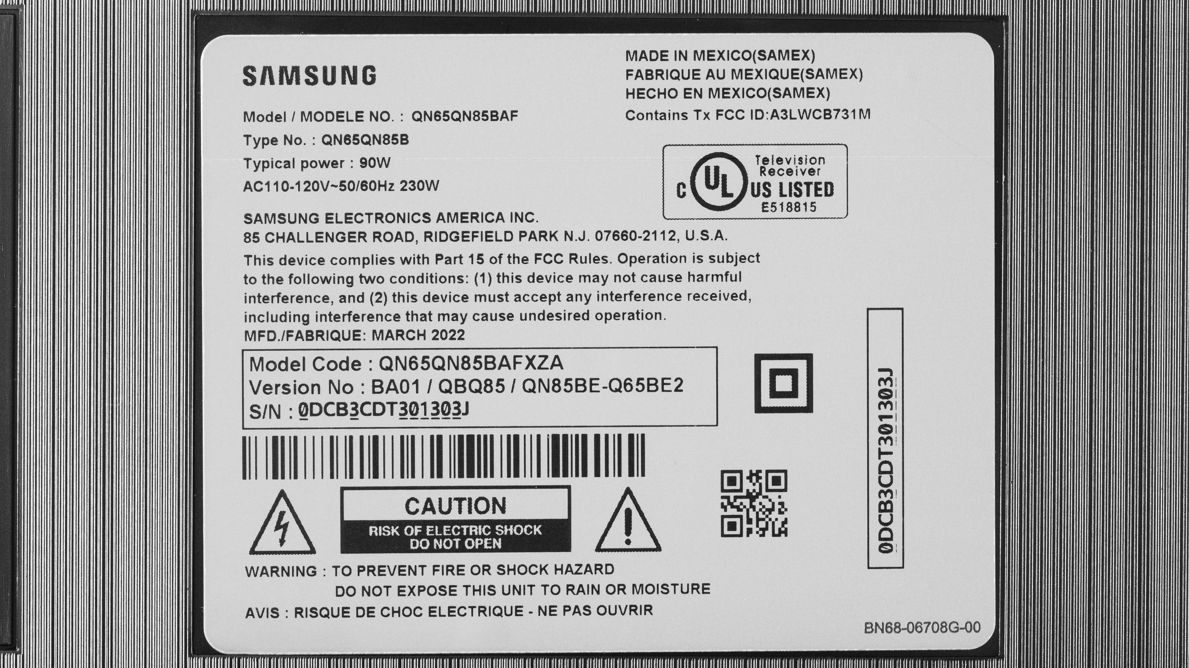 We tested the 65-inch QN85B (QN65QN85BAFXZA), which is also available in 55-inch, 75-inch, and 85-inch sizes. The 85-inch model uses a VA panel, so it has better native contrast but a worse viewing angle. Note that with Samsung TVs, the six letters after the short model code (AAFXZA in this case) vary between specific retailers and regions and even between different retailers.