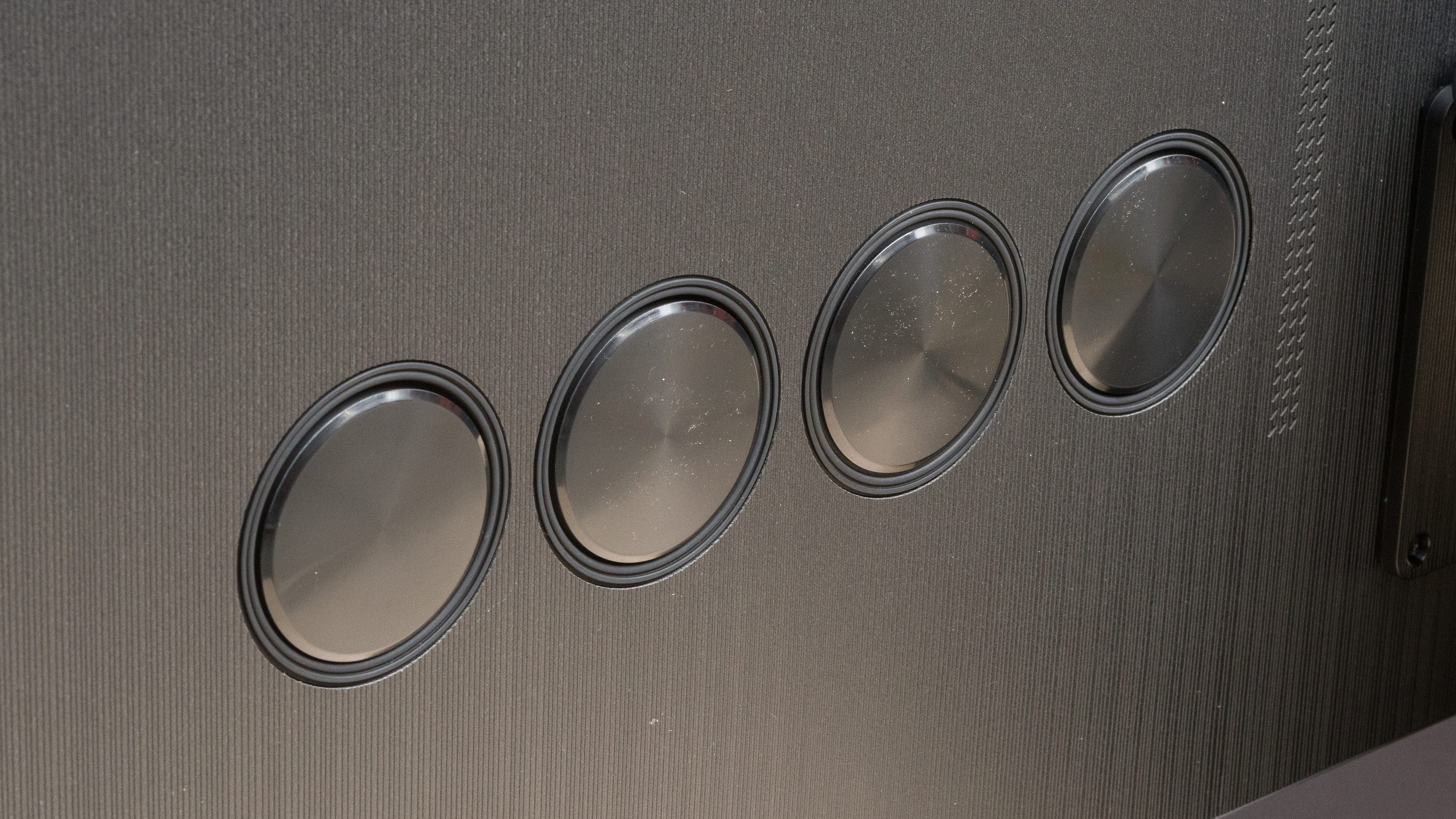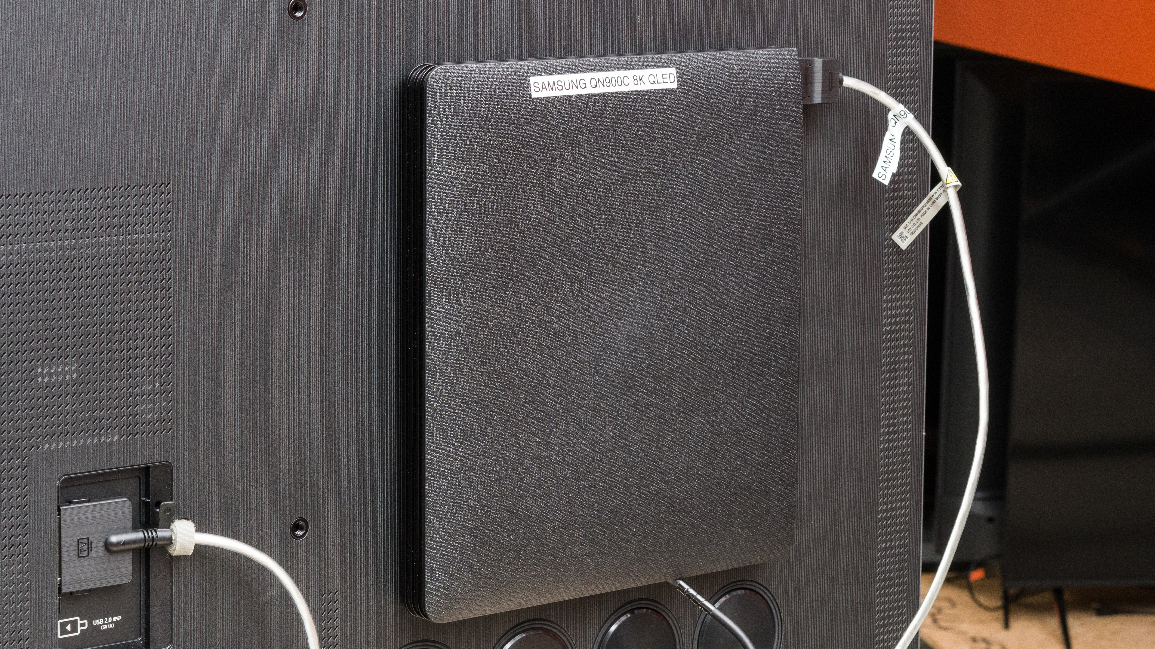 The back of the TV is made of a large flat plastic panel with a new vertical pattern design. If you want to keep the One Connect box with the TV instead of placing it on a shelf, you can either mount it to the back of the stand or to the back of the TV. Since all of your inputs go to the One Connect box instead of the TV itself, there's nothing to help with cable management. There are also eight speakers on the back of the TV designed to improve the frequency response of the TV.