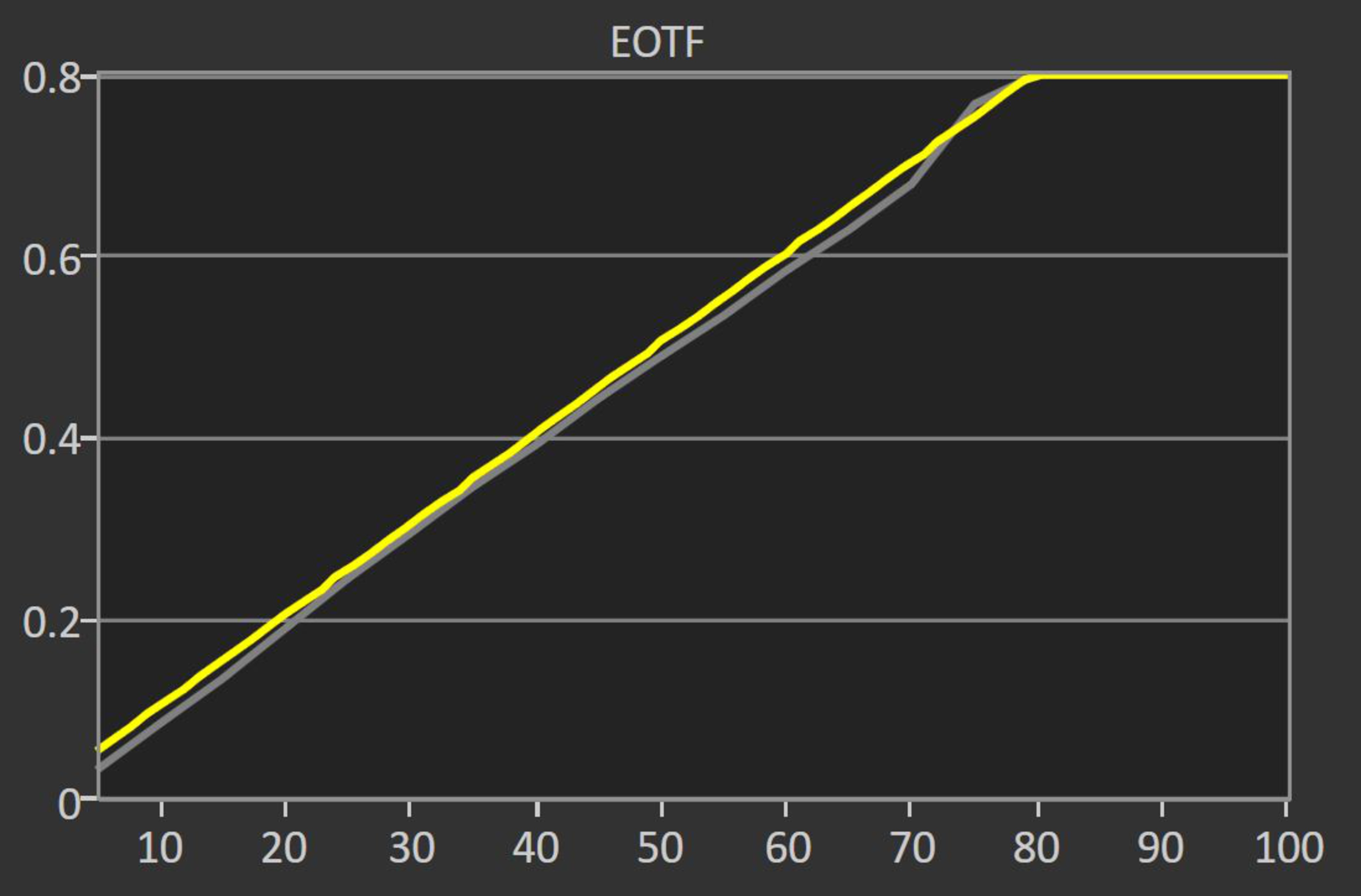 The Samsung QN900C has amazing PQ EOTF tracking after adjusting the Gamma: ST2084 from its default setting of 0 to +1. Dark shadows, midtones, and highlights are displayed a bit darker than intended, and there's an extremely sharp cutoff at the TV's peak brightness, which causes a loss of bright details in extremely bright scenes.