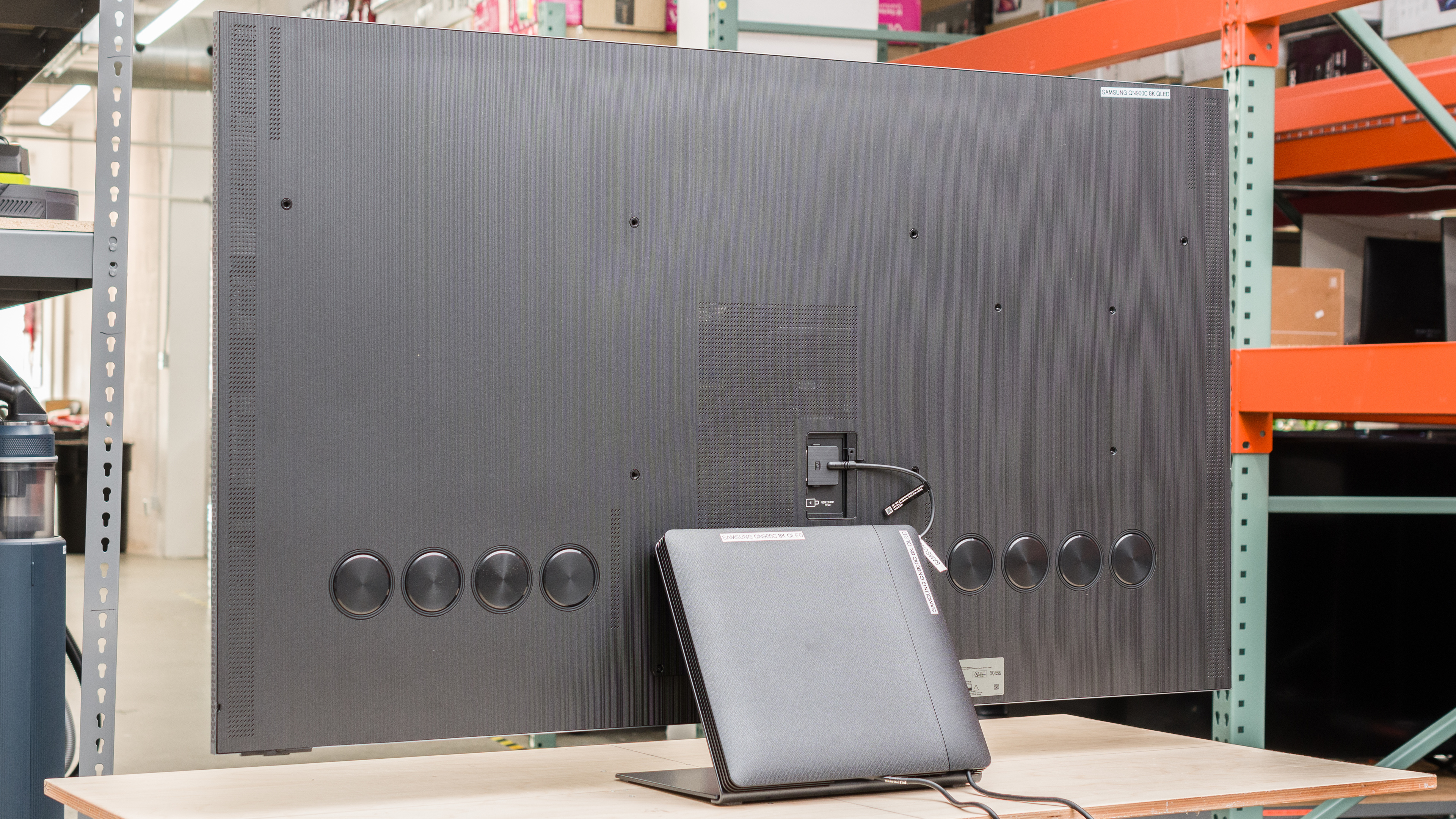 The Samsung QN900C has great build quality overall, but there are some issues. The plastic back panel has worse flex than most other TVs, particularly towards the sides. The back panel protrudes on both the top left and right edges, and when we attempted to press them back in, there was an audible clicking sound. The issues with the back panel aren't likely to cause any problems, and they're not noticeable when watching the TV, but they do show some reoccurring issues with Samsung's quality control since we had similar issues with the Samsung QN900B 8k QLED.