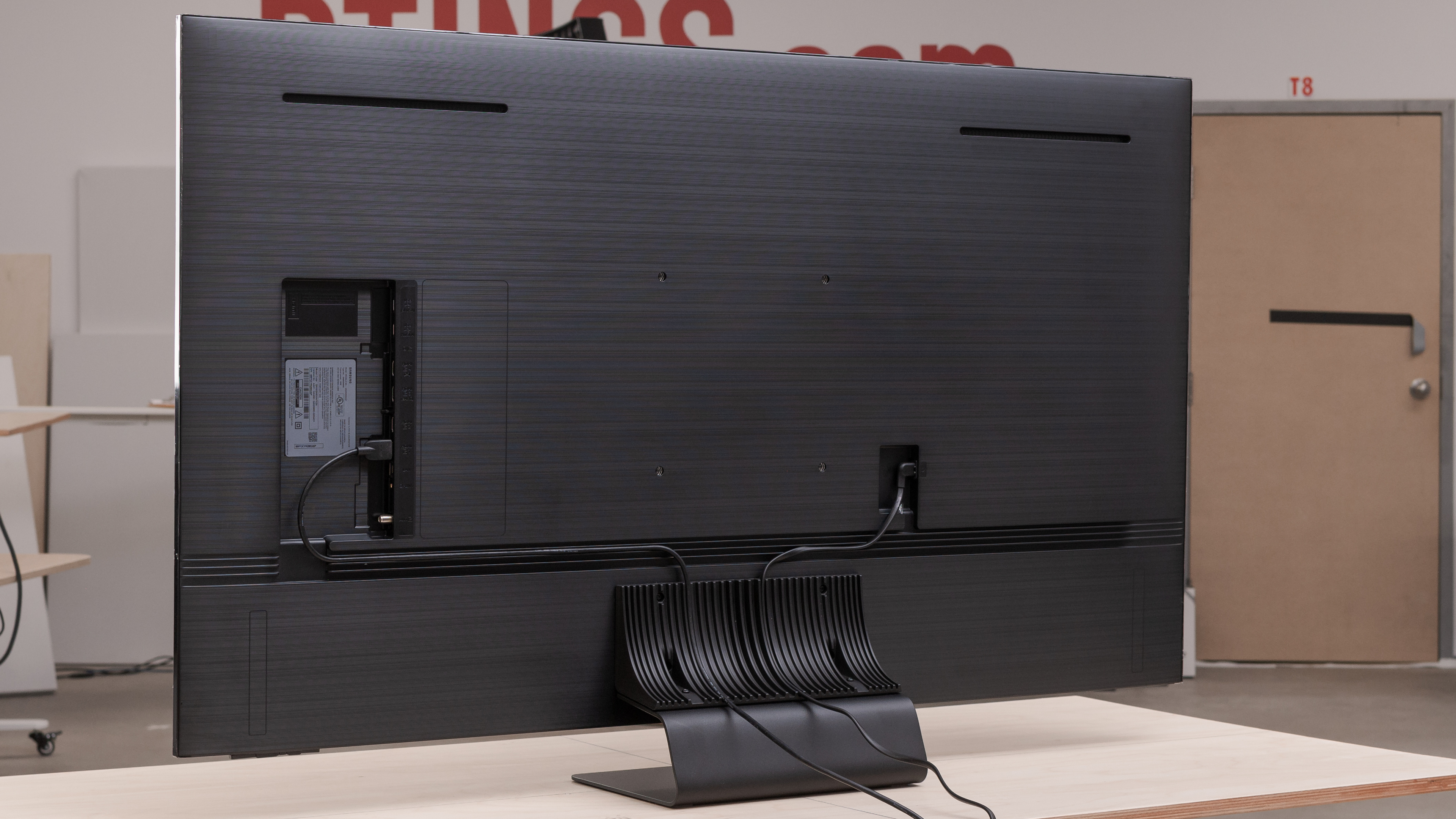 The back is made of an etched plastic panel and there are tracks for cable management. The inputs are side-facing, but because they're set into the TV with a wall around them, they're hard to reach if you wall-mount the TV.