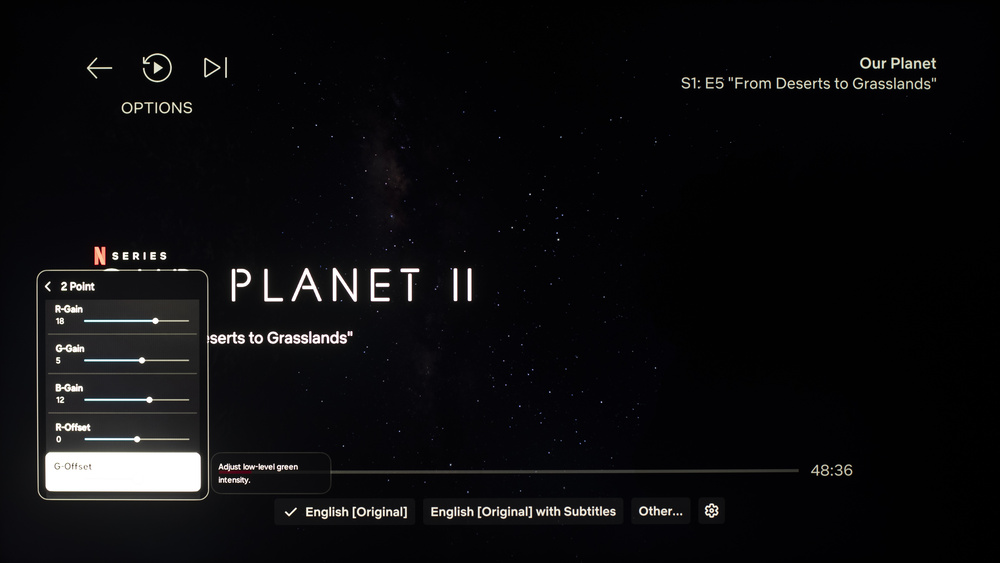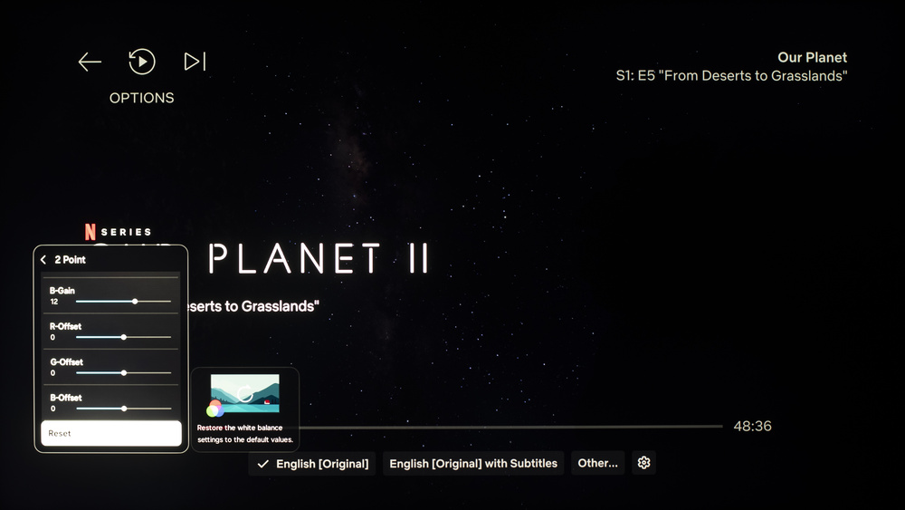 The following are the results of the white balance and colorspace calibration on our unit. They are provided for reference, and should not be copied as the calibration values vary per individual unit, even for the same model and size as the TV we reviewed, due to manufacturing tolerances. If you want to try them you will need to enter all values shown, as all of them are active at the same time. If you end up with worse picture quality, simply reset them to the default values.