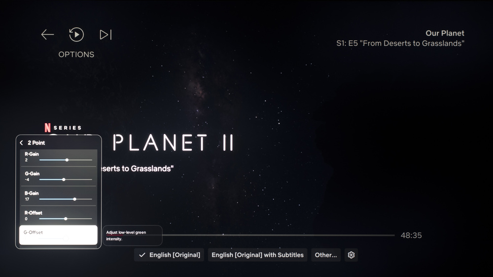 The following are the results of the white balance and colorspace calibration on our unit. They are provided for reference, and shouldn't be copied as the calibration values vary per individual unit, even for the same model and size as the TV we reviewed, due to manufacturing tolerances. If you want to try them, you will need to enter all values shown, as all of them are active at the same time. If you end up with worse picture quality, simply reset them to the default values.