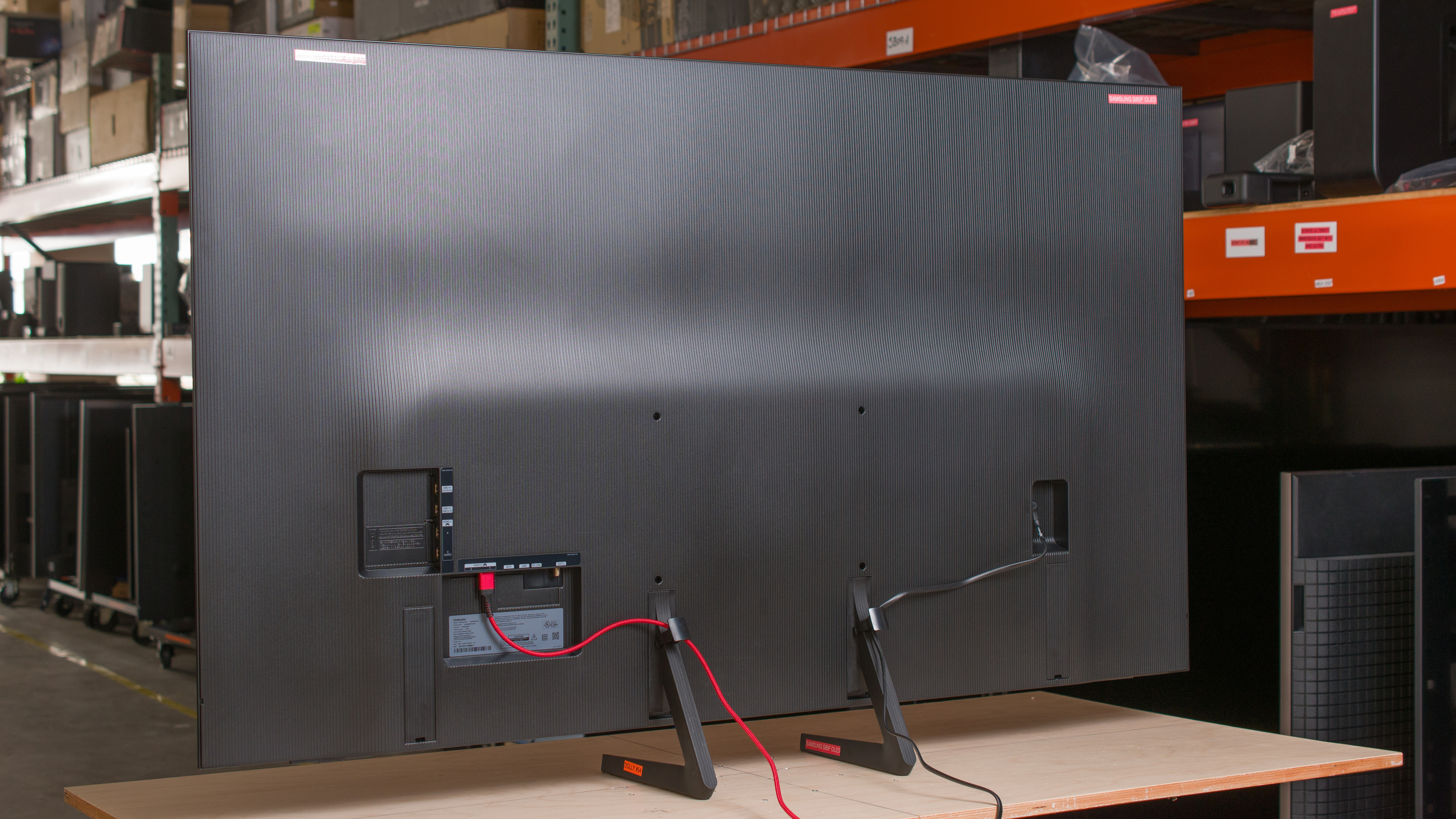 The back of the TV is made entirely of plastic. It feels a bit loose against the panel, and the entire back of the TV flexes when pressed on. The ports are located in three recessed cutouts, which makes them hard to access if you have the TV mounted flush to the wall. If you don't wall mount the TV, it comes with two clips that can be attached to the feet for cable management.