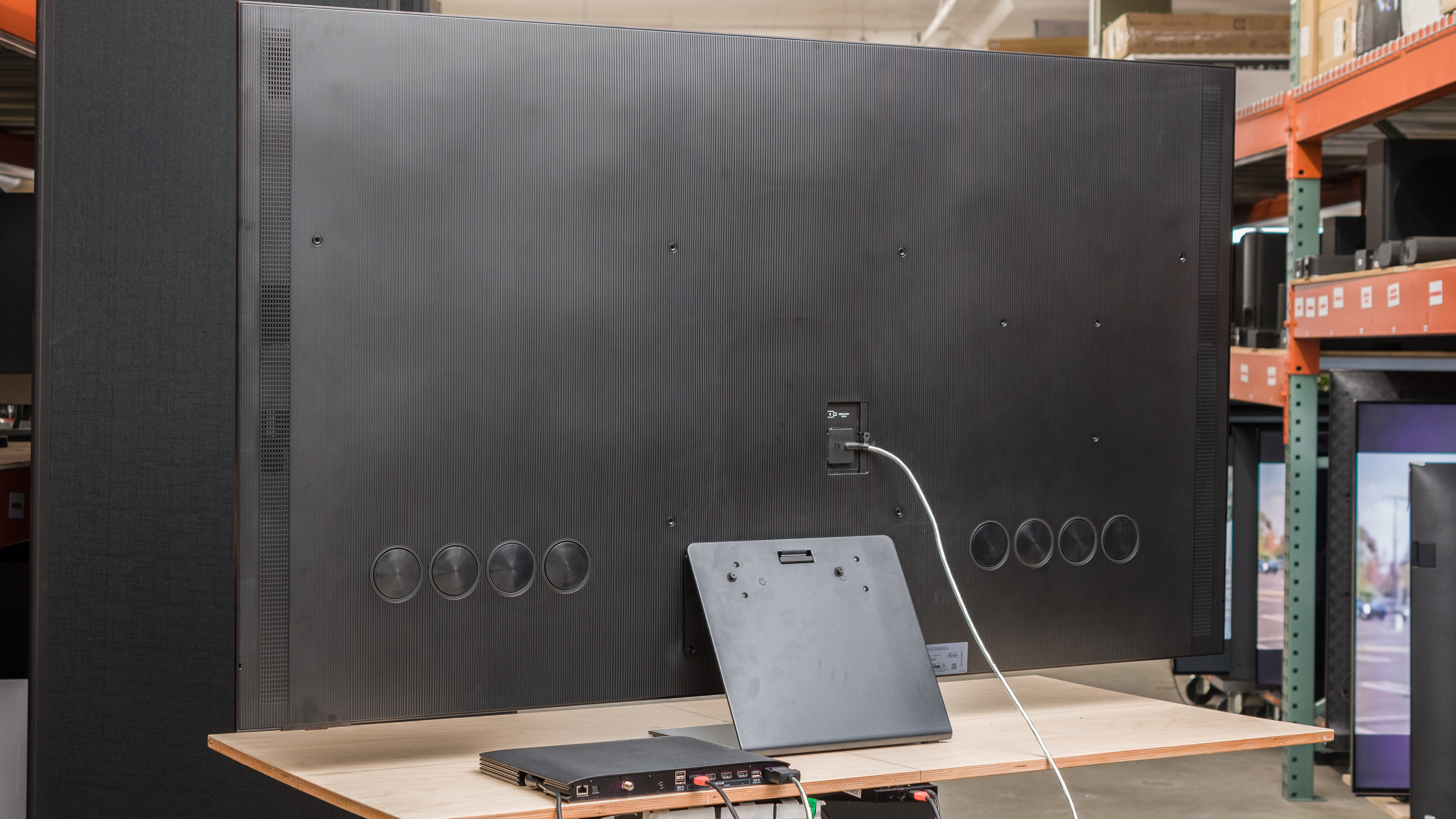 The back of the TV is very different from the 2022 Samsung S95B OLED. Samsung has decided to move the inputs to an external Slim One Connect box, so you can place the input box away from the TV. It's a versatile feature, as you can leave the input box on your table or mount it to the back of the TV or the back of the stand. There are no other clips or anything for cable management, though.