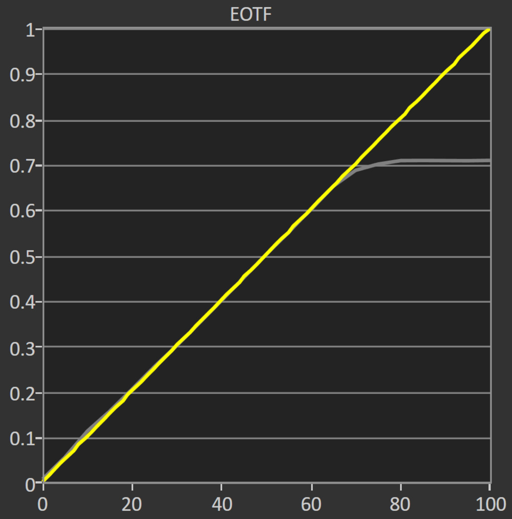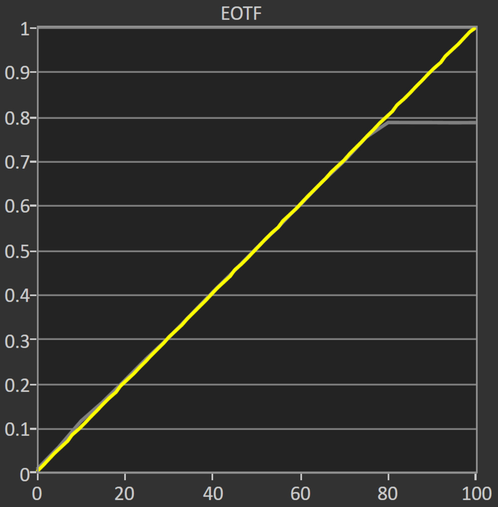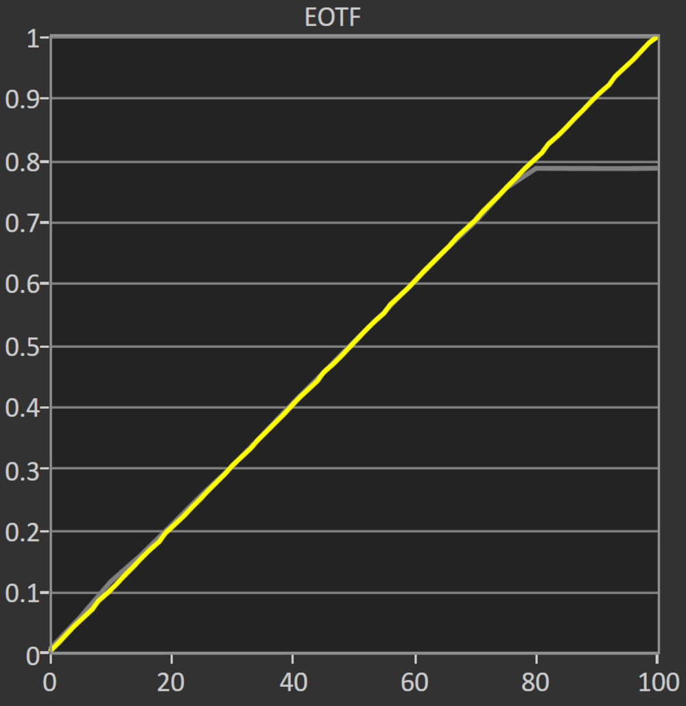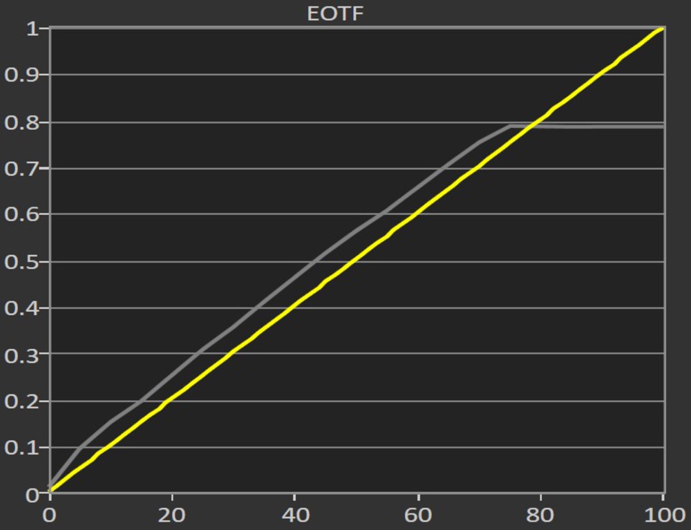 The TV has superb PQ EOTF tracking, which ensures that most content displays at the correct brightness level. There's a sharp cutoff near the TV's peak brightness for content mastered at 600 and 1,000 nits, so there's some clipping in really bright scenes in content mastered at those levels, which is most content. There's a smoother roll-off with content mastered at 4,000 nits, with less clipping, but very little content is mastered at that level.