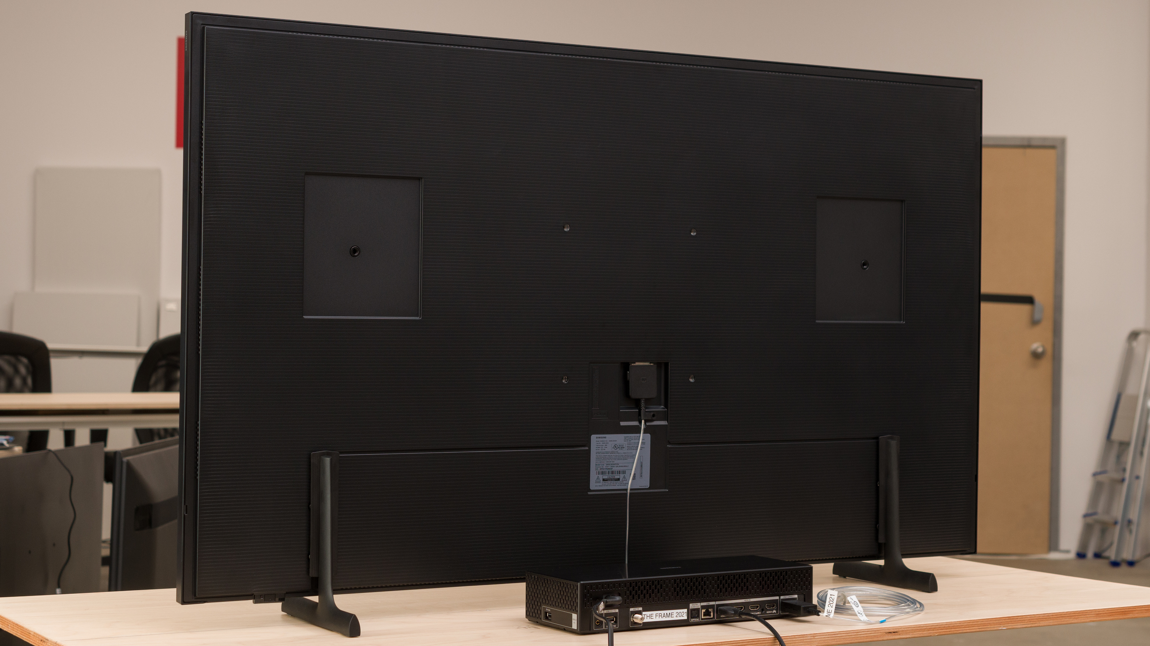 The back is plastic and has etched horizontal lines that feel more prominent than on the 2020 model. There are cable management tracks to guide the One Connect cable towards the feet or down the middle. The no-gap wall mount is included.