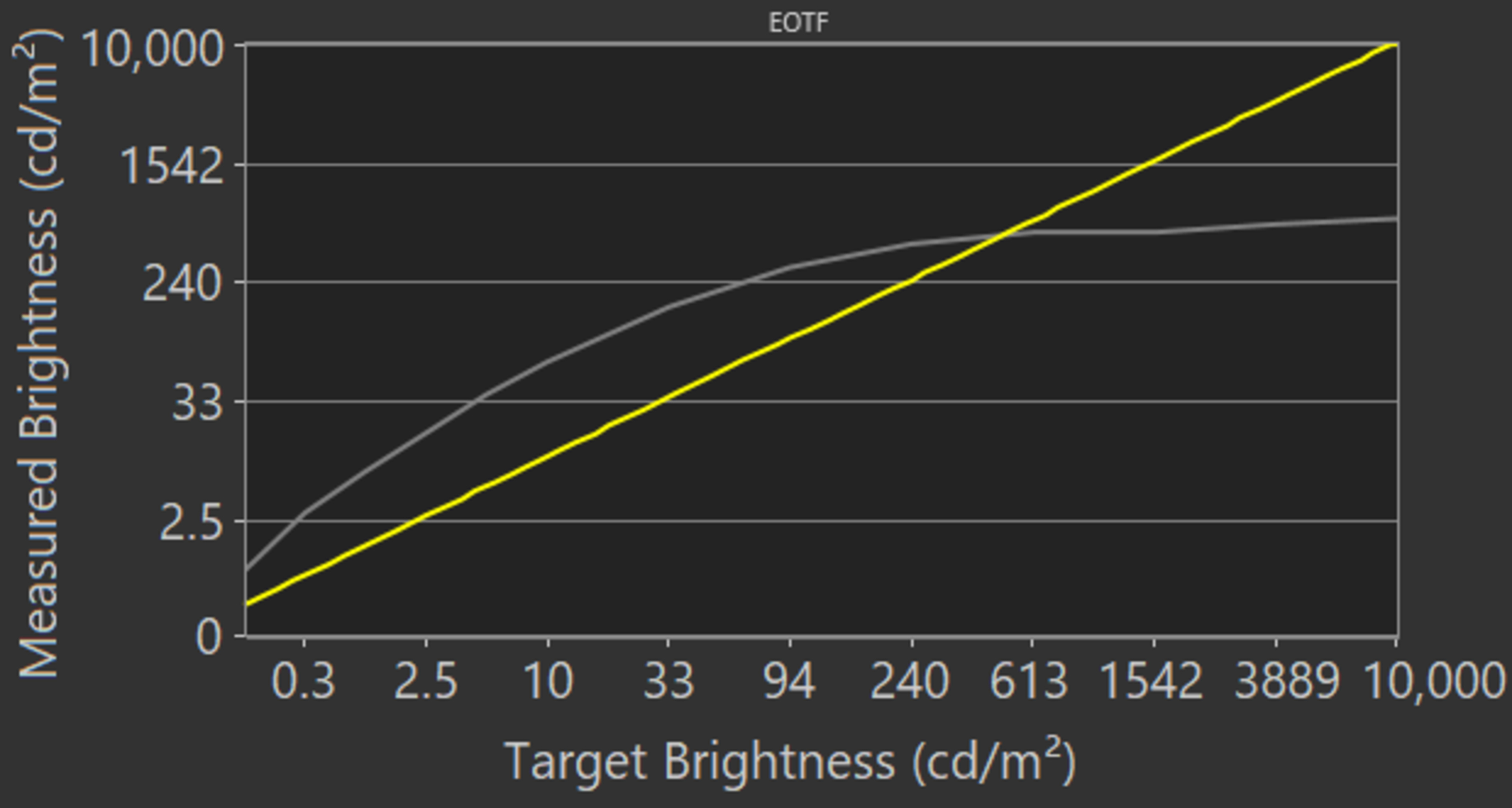 The HDR brightness in Game Mode is a bit brighter than outside of Game Mode, but there's frame dimming in the 2% windows, which means small highlights in dark scenes appear dimmer. The EOTF doesn't follow the curve as well as outside of Game Mode; all scenes appear darker than they should. If you want to make HDR brighter in Game Mode, set Contrast Enhancer to 'High' and ST.2084 to max.