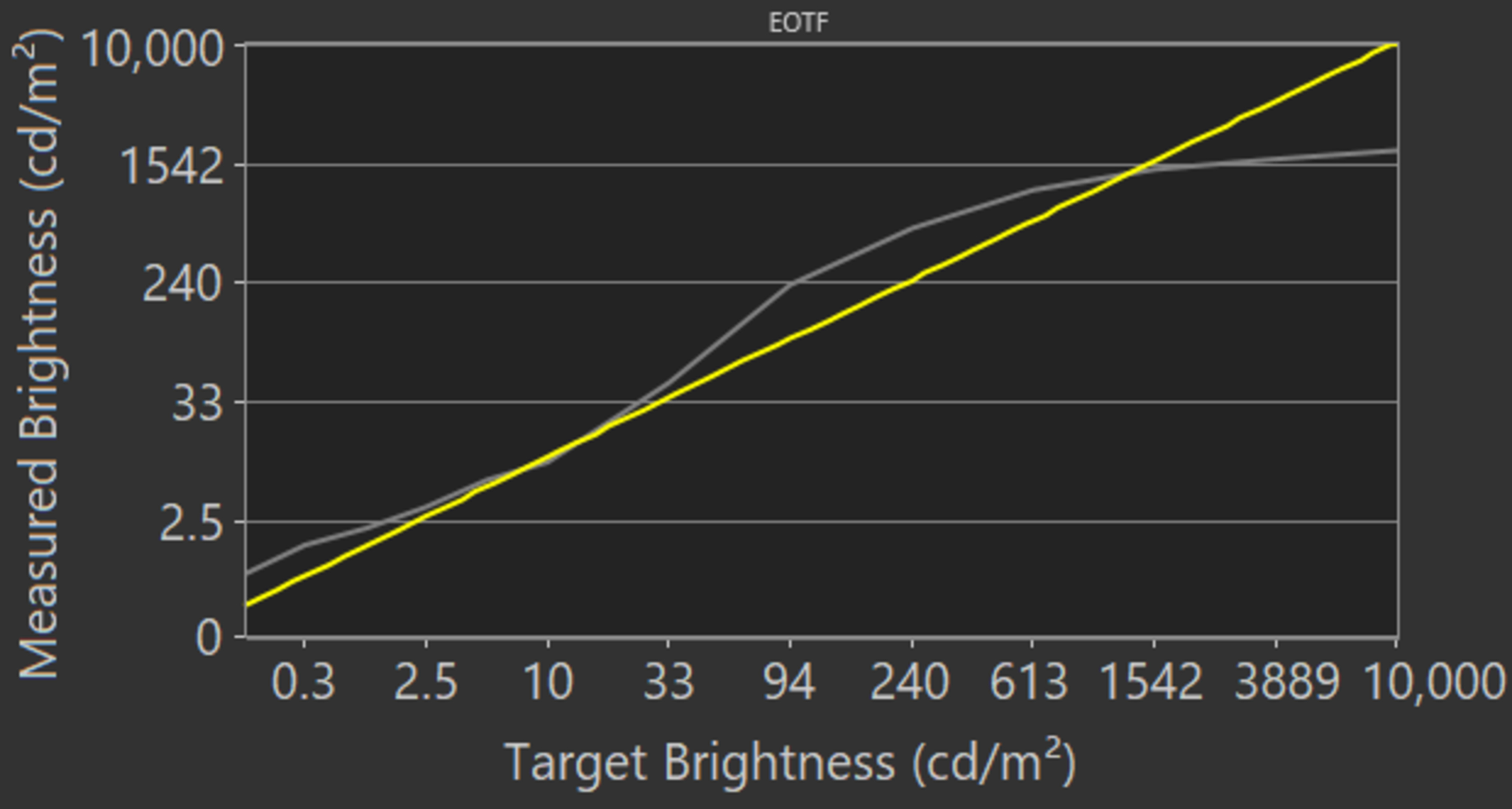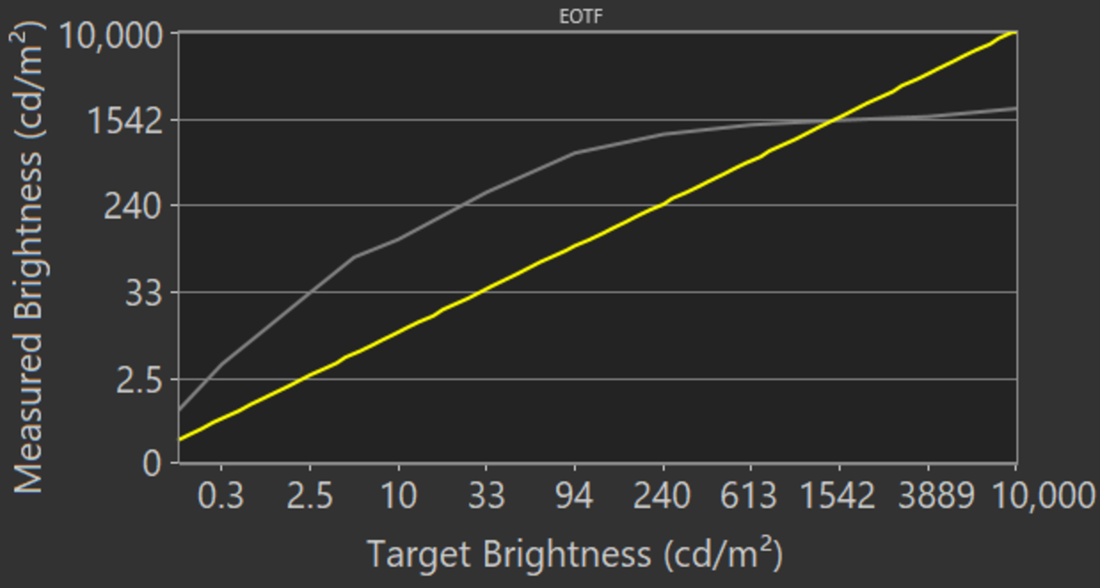 The Samsung Terrace has an impressive HDR color gamut. It has outstanding coverage of the commonly-used DCI P3 color space and decent coverage of the wider Rec. 2020. The EOTF doesn't follow the PQ curve well, resulting in most scenes appearing too bright. The 'Game' mode EOTF is better, but some scenes are still over-brightened. If you find HDR content too dim, set Contrast Enhancer to 'High', ST.2084 and Shadow Details to max. These settings provide a much brighter image, as you can see in this EOTF.