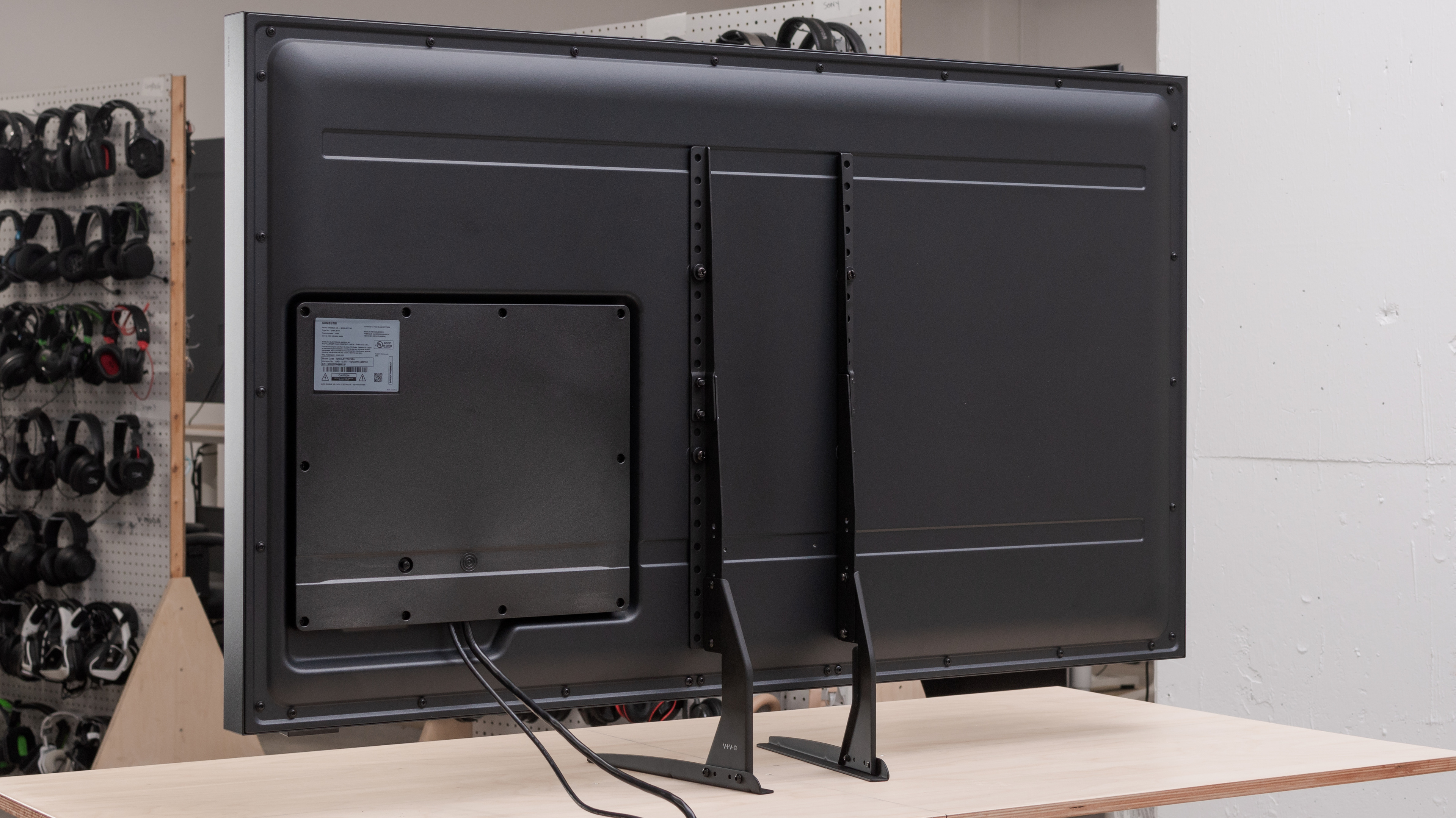 The back of the TV is all metal, except for the plastic panel covering the inputs. There are small cable routes at the bottom of the panel to allow the cables to pass through for cable management. The panel is held by screws to protect the inputs from any potential water damage.