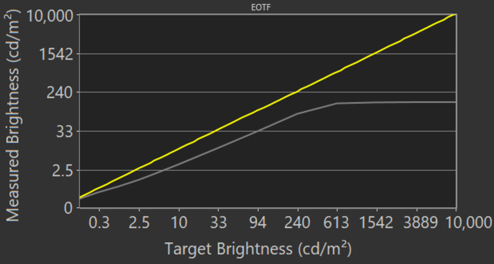 Like most Sony TVs, the Sony Bravia XR A80J has incredible PQ EOTF tracking. The vast majority of content is displayed at the exact brightness level the content creator intended. There's a very smooth roll-off near the TV's peak brightness, preserving fine details in bright areas of the screen.