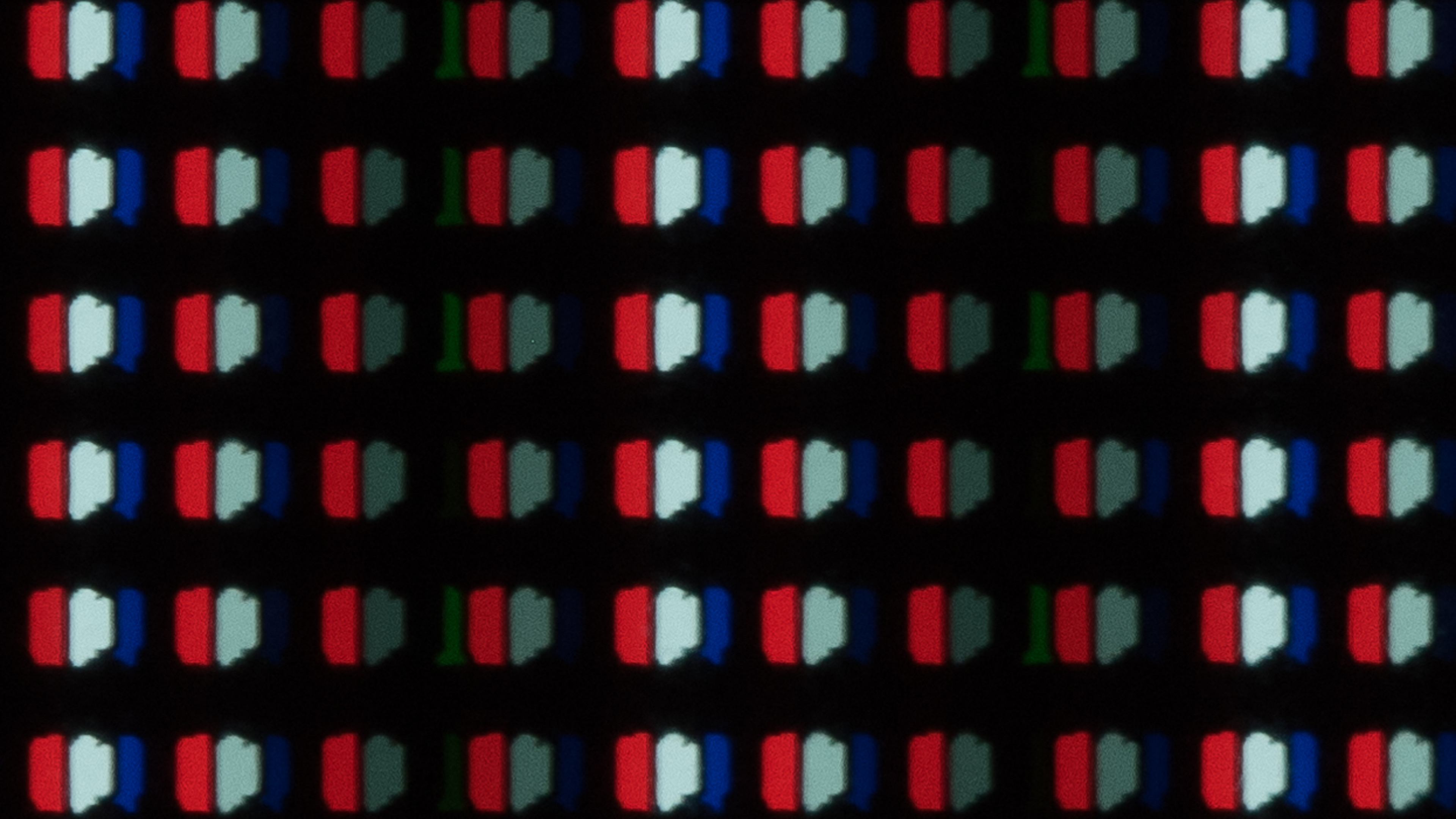 The Sony Bravia XR A80J uses a WRGB sub-pixel layout, where all four subpixels are never lit simultaneously. You can see some of the blue sub-pixels lit up in this photo.
