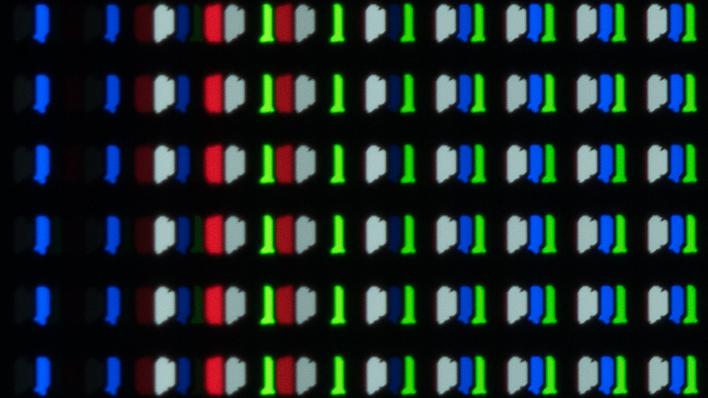 The Sony A90J uses a WRGB sub-pixel layout, where all four subpixels are never lit simultaneously. While this TV is said to be able to brighten all four pixels at once to achieve a higher peak brightness, we never saw all four sub-pixels lit at the same time, even when we recorded 1291 nits. You can see some of the blue sub-pixels lit up in this photo.