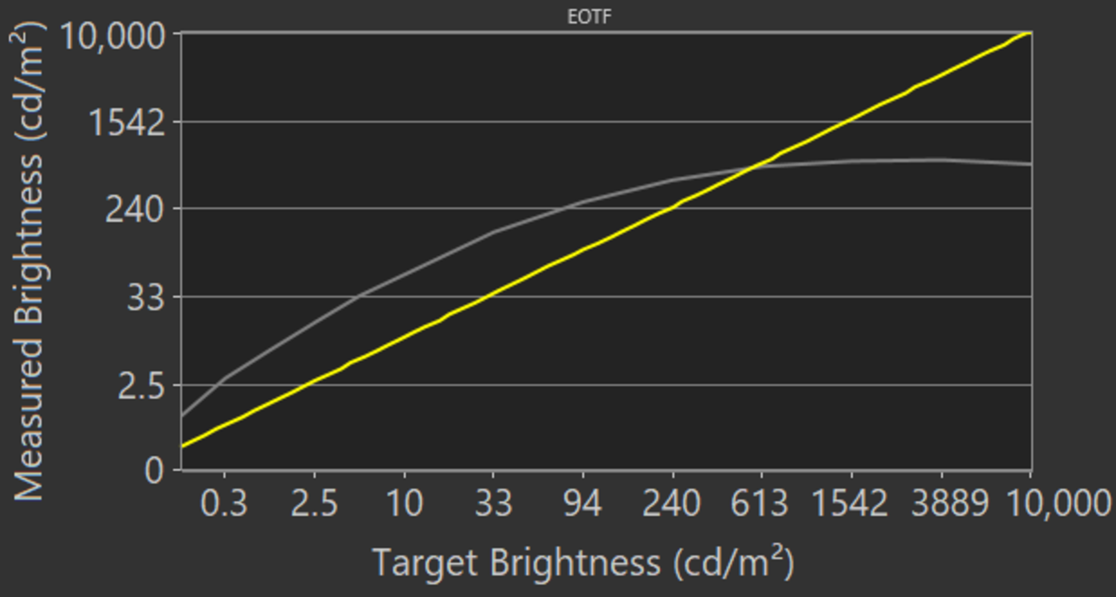 The TV has superb PQ EOTF tracking, so content is displayed at the correct brightness level. It's slightly over-brightened at all luminance levels but barely so, and it never strays far from what it should be. The TV follows the curve nearly perfectly up until the panel's max brightness, followed by a slow roll-off which preserves bright details.