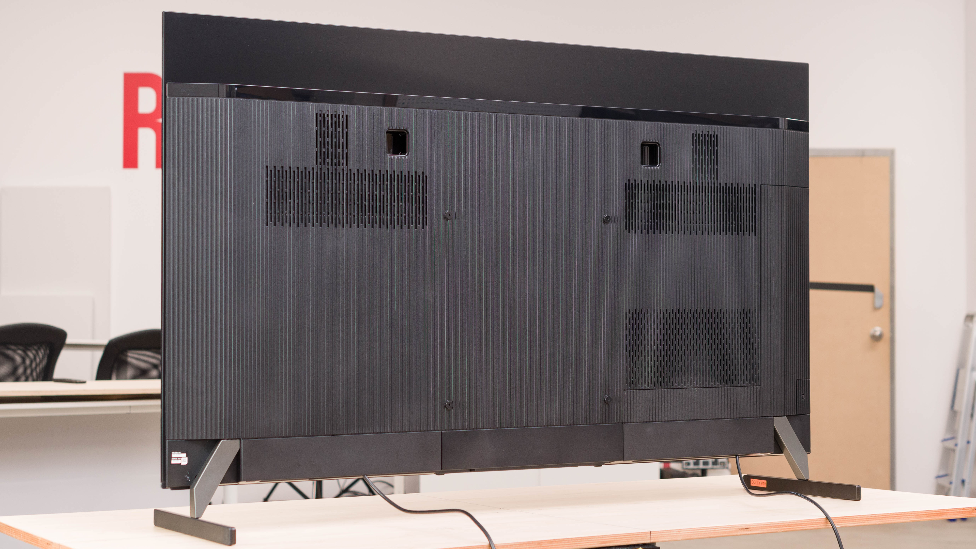 The Sony A90J doesn't have much in the way of cable management except for some paneling that covers a portion of the cables and an included cable tie, but overall it looks fairly clean. The back of the panel itself is metal, while the rest is plastic with vertical ridges. Some of the inputs are bottom-facing and are hard to reach when the TV is wall-mounted.