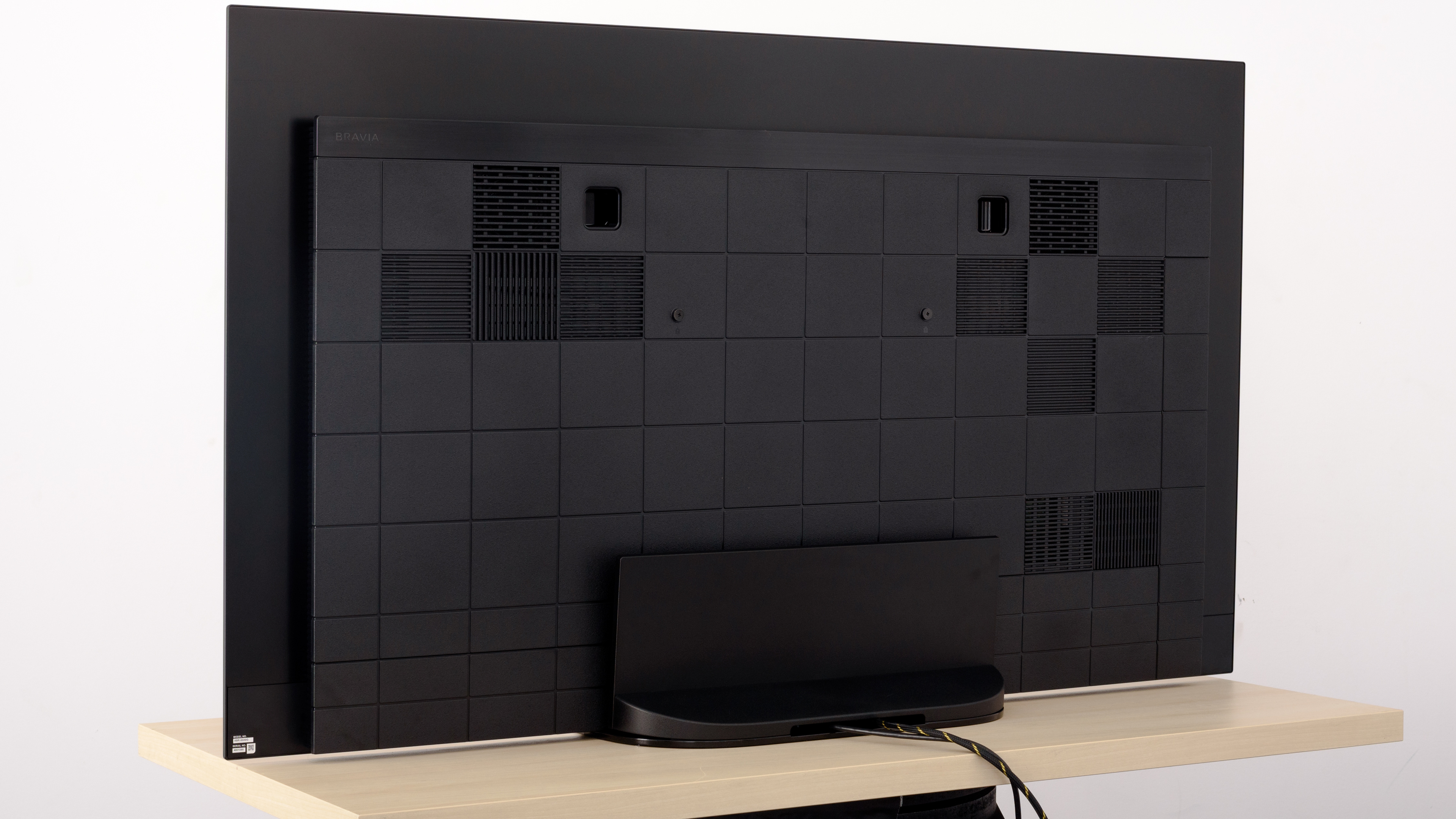 The back of the TV has an interesting checkerboard design, with vents for cooling the TV's internals and panels to hide the inputs. There's cable management built-in, routing all the cables to a single exit at the bottom for a clean setup.