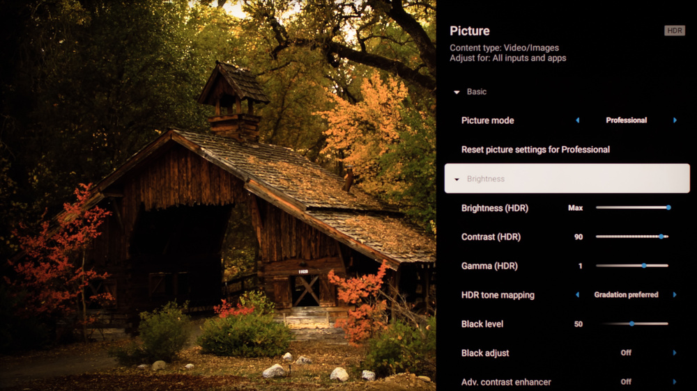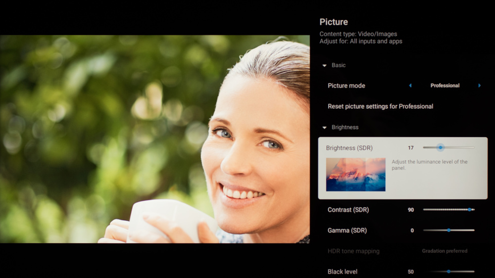 For SDR content, you can choose a few different preset picture modes. We used the Professional picture mode because it's the most accurate out of the box and allows for the most customization. A Brightness setting of '17' corresponds to about 200 nits on our unit with peak luminance on 'High,' which is our target for a moderately lit room, but you should adjust this setting to your viewing conditions. Below are the settings we used for SDR. All other settings were either disabled or left off. If you're in a dark room, a gamma setting of -2 is a good choice, as that's the setting most commonly used during the mastering process.