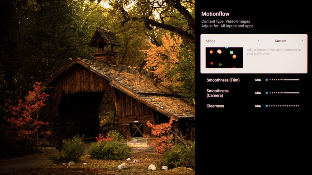 This TV automatically removes judder from 24Hz sources. For 60p/i signals, like a cable box or from streaming apps, set CineMotion to 'High' and Motionflow to 'Custom' with the Smoothness: Film, Smoothness: Camera, and Clearness sliders set to minimum.