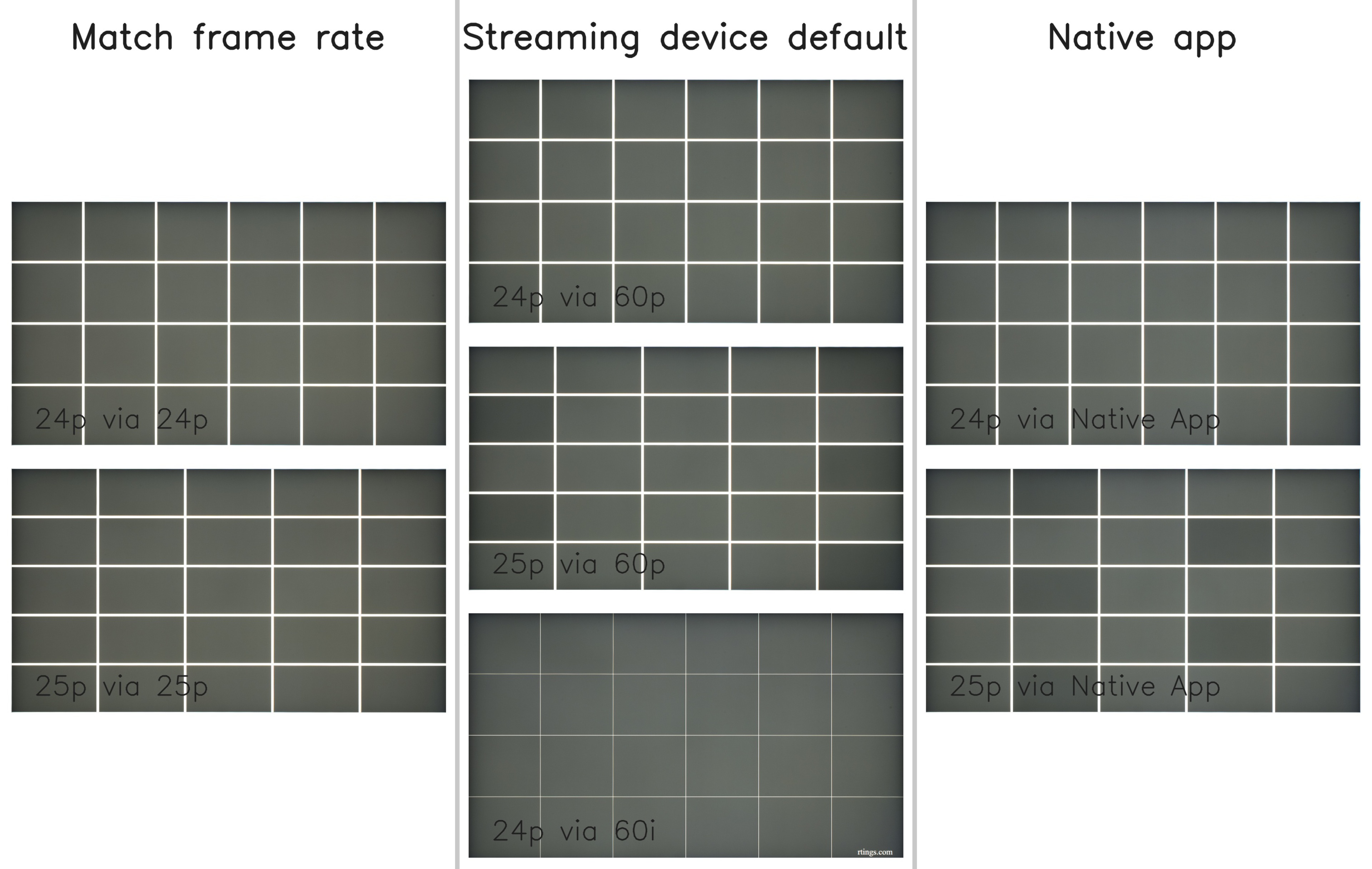 The TV removes 24p judder from any source, including those that output content in 60Hz, which helps with the appearance of motion in movies and shows. It also removes 25p judder from external sources that can send a 25Hz signal, like an Apple TV. It doesn't entirely remove 25p judder from 60p signals or from the native apps, but frame times are fairly consistent, so motion is just a bit jittery.