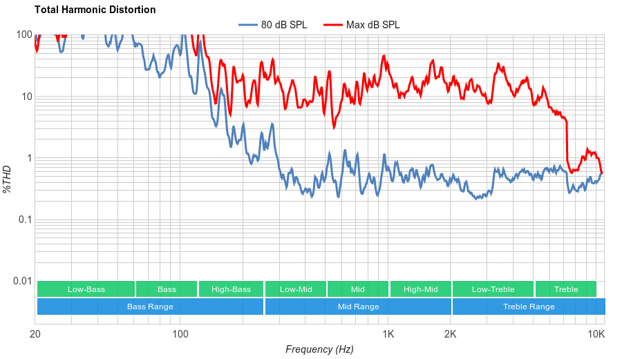 Passable distortion performance. THD and IMD levels are relatively low at lower volumes but skyrocket when the TV's speakers are pushed to their maximum. While rattling and overall distortion is noticeable at peak output, it shouldn't be an issue at more common levels.