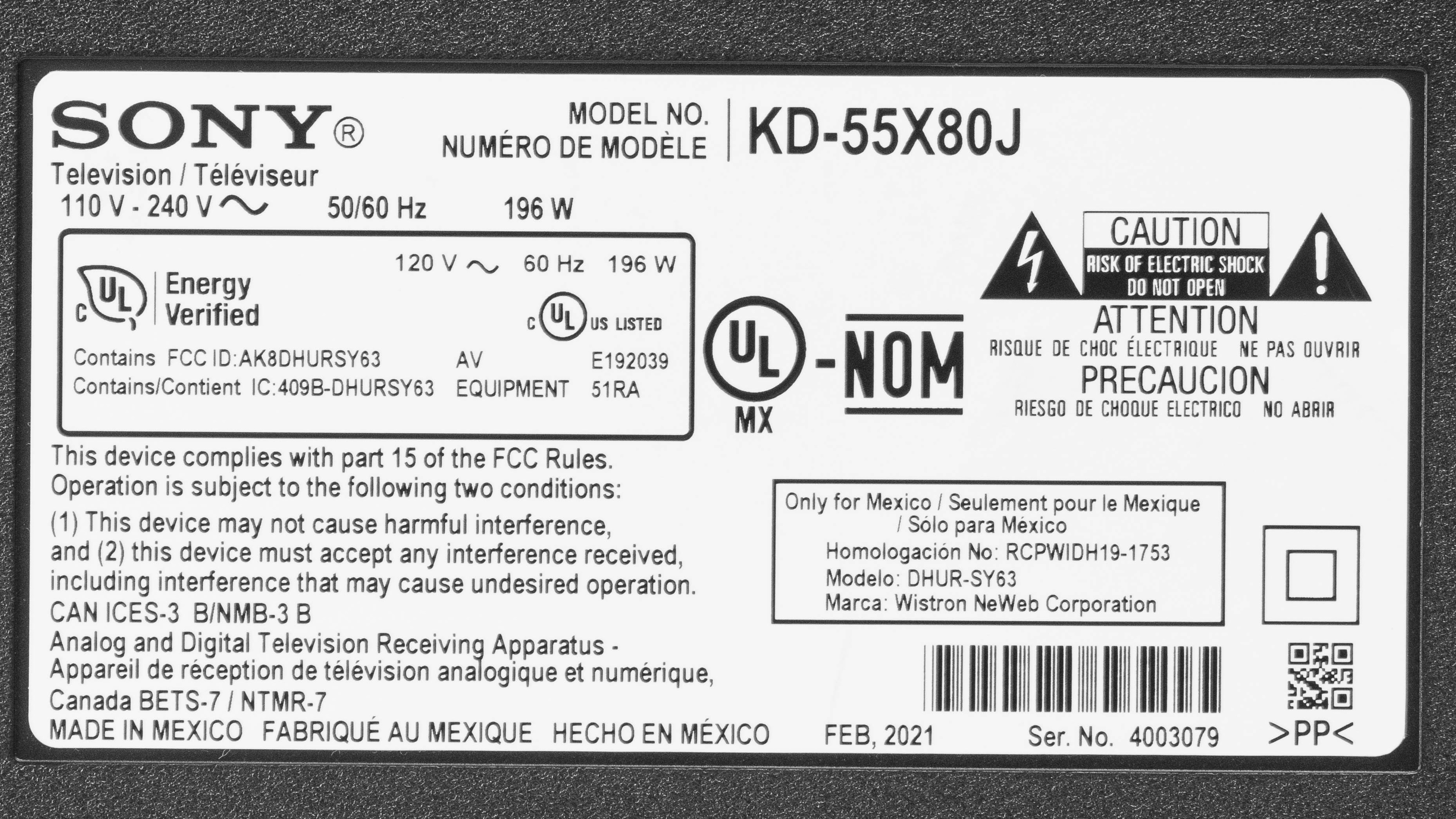 We tested the 55 inch Sony X80J (KD-55X80J), which is also available in 43, 50, 65, and 75 inch sizes. For the most part, we expect our results to be valid for those sizes, except for the 50 inch, which uses a different panel. There are also variants of the 55, 65, and 75 inch models with the model code X80CJ. That version appears to be the Costco and Sam's Club model, which should perform the same, except it comes with Sony's new Bravia CORE streaming service, which can stream movies at up to 80 Mbps, according to Sony. In Europe, you'll see the X80J sold alongside the X81J, but as far as we know, the two have the same specs. In Italy, it's called the X80JP.