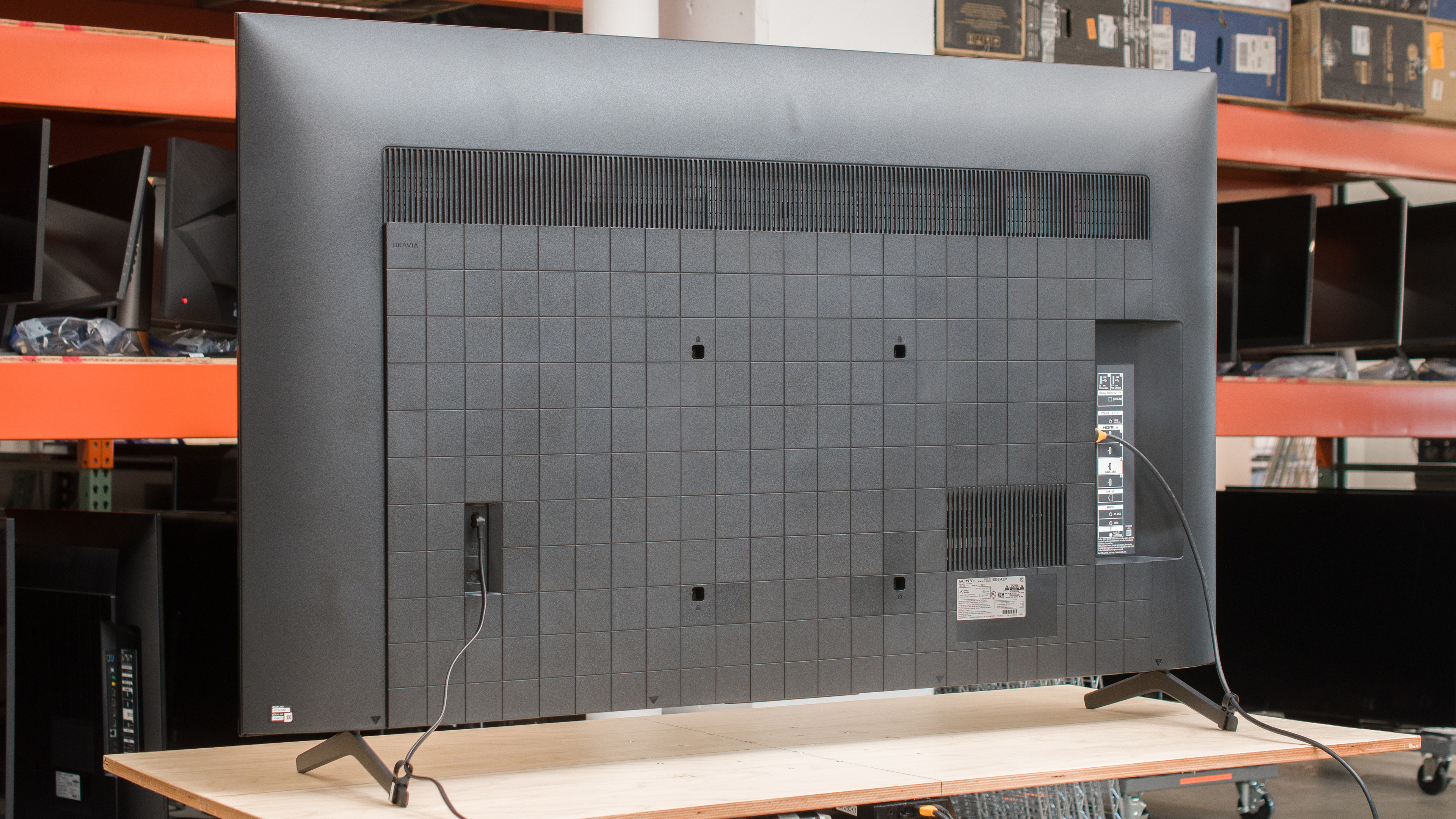 The back features a checkerboard pattern that gives it a bit of character. The inputs are side-facing, but they're set into the back, so they aren't the easiest to access with the TV wall-mounted on a fixed bracket. There are clips on the back of each foot for cable management.