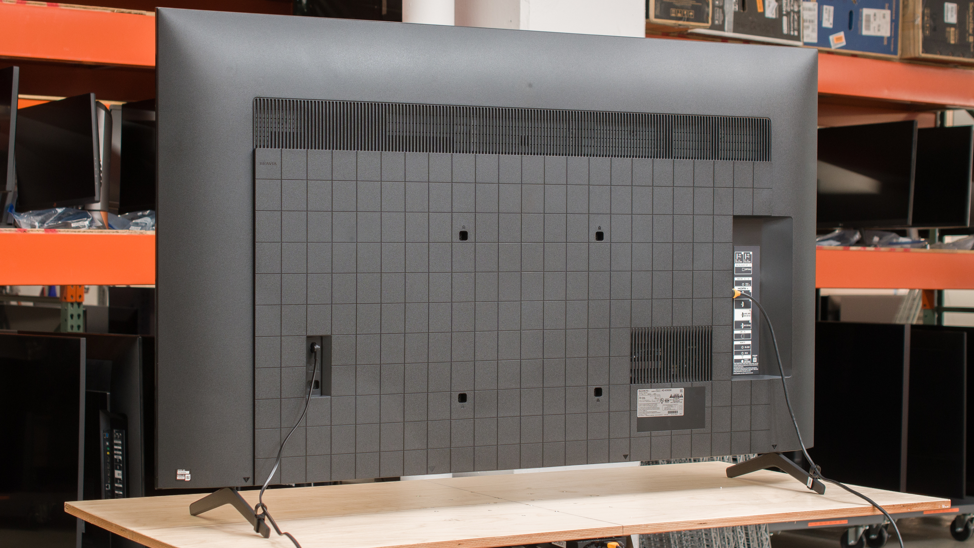 The Sony X85K has a plastic back with a checkerboard pattern typical of Sony TVs. The inputs are side-facing and set into the TV, so they're difficult to reach with the TV wall-mounted. It has basic cable management with hooks on the feet to guide the cables to the inputs.