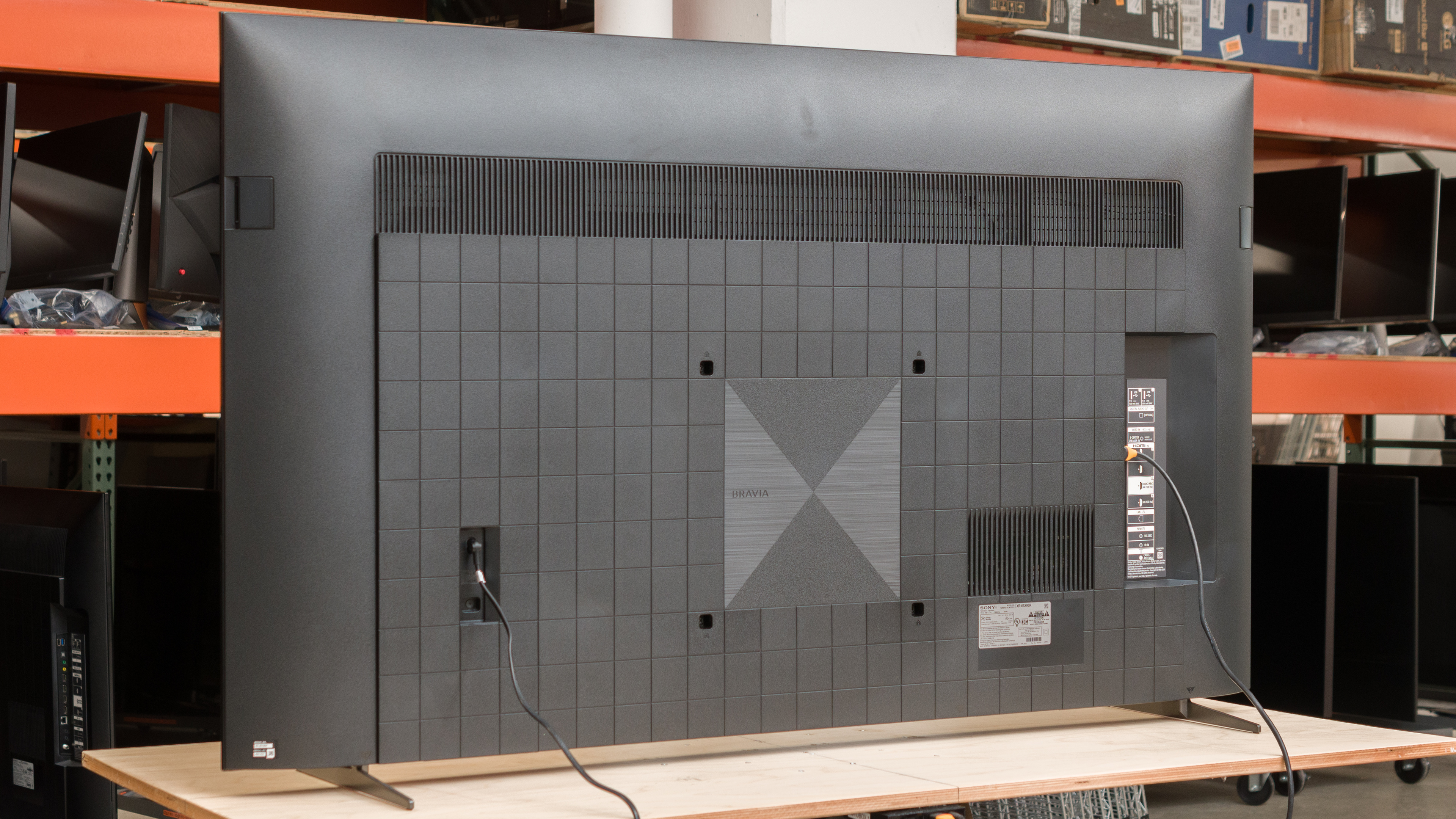 The back of the Sony X90K features textured plastic with some aluminum in the center. The inputs are set into the TV, so they're a bit hard to reach with the TV wall-mounted. Sadly, it doesn't feature any cable management.