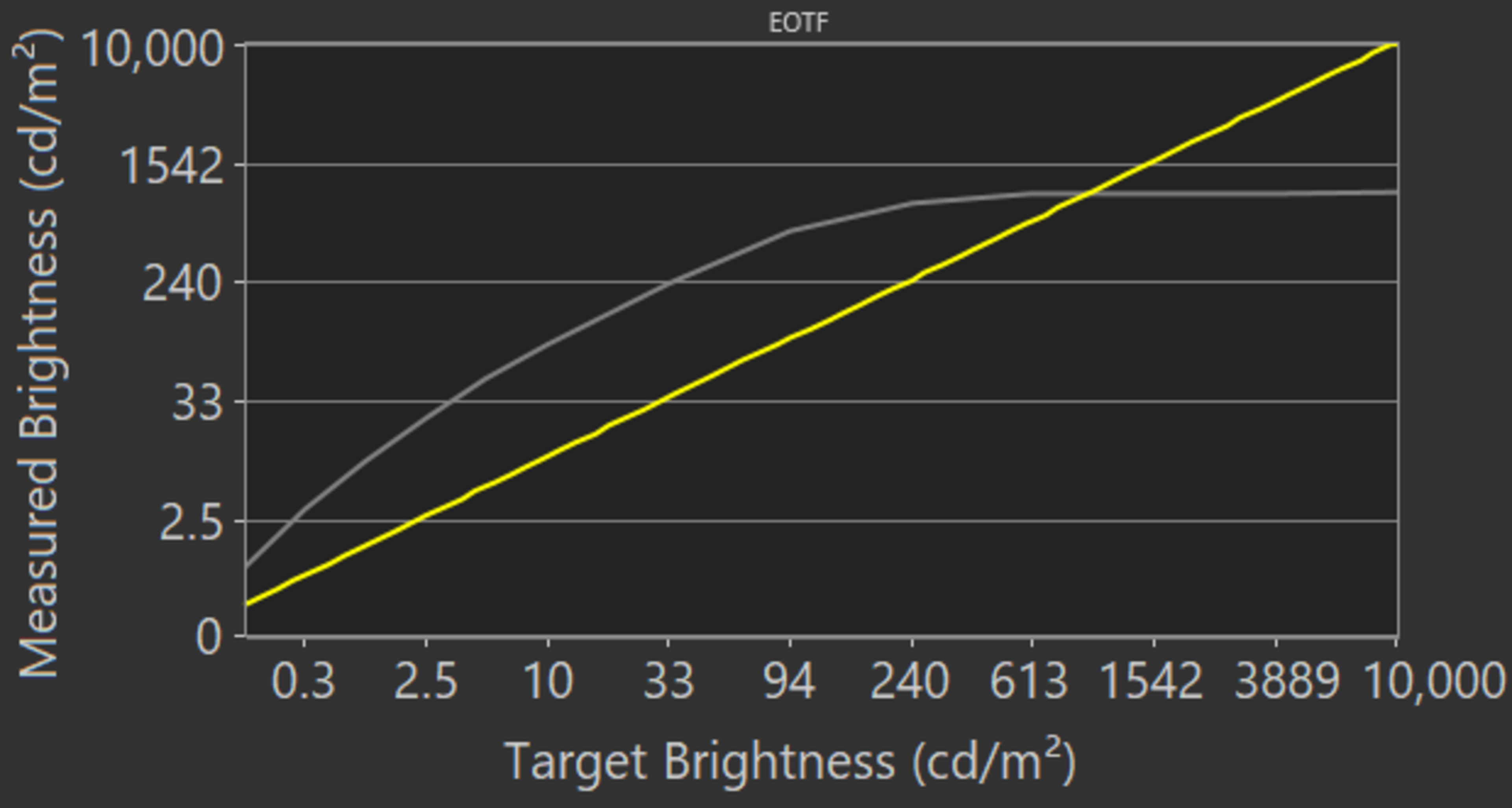The EOTF follows the target curve incredibly well, meaning that most content is displayed at the correct brightness level in HDR. Shadow details are displayed incredibly well, with no noticeable black crush. Midtones are slightly dimmer than they should be, but it's not a noticeable difference, and there's a fine roll-off near the TV's peak brightness, ensuring that fine details in bright scenes are preserved.