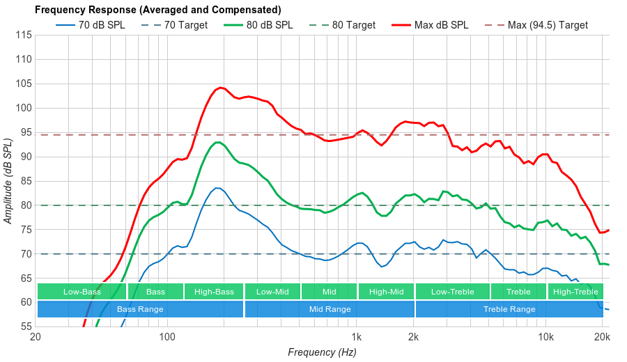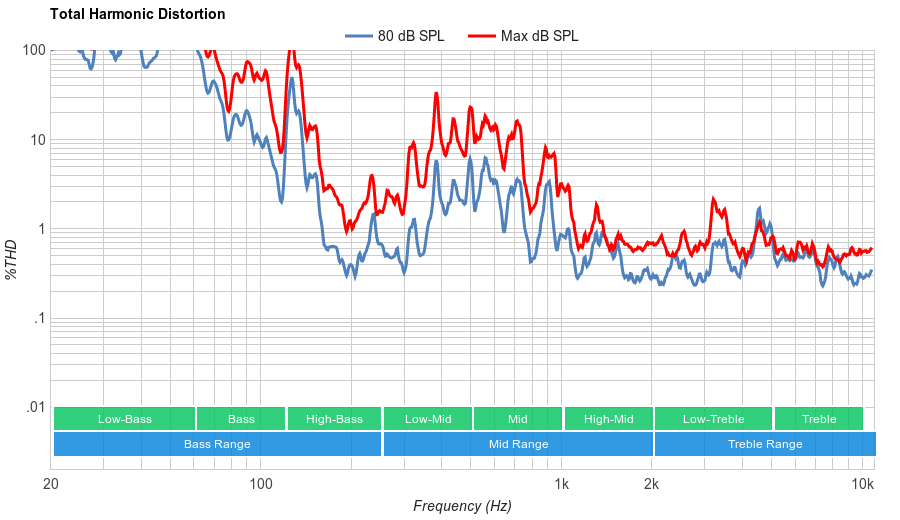 Poor distortion performance. The amount of distortion at 70 is about average, but it steeply rises as the volume is raised. Maximum volume distortion is especially bad.