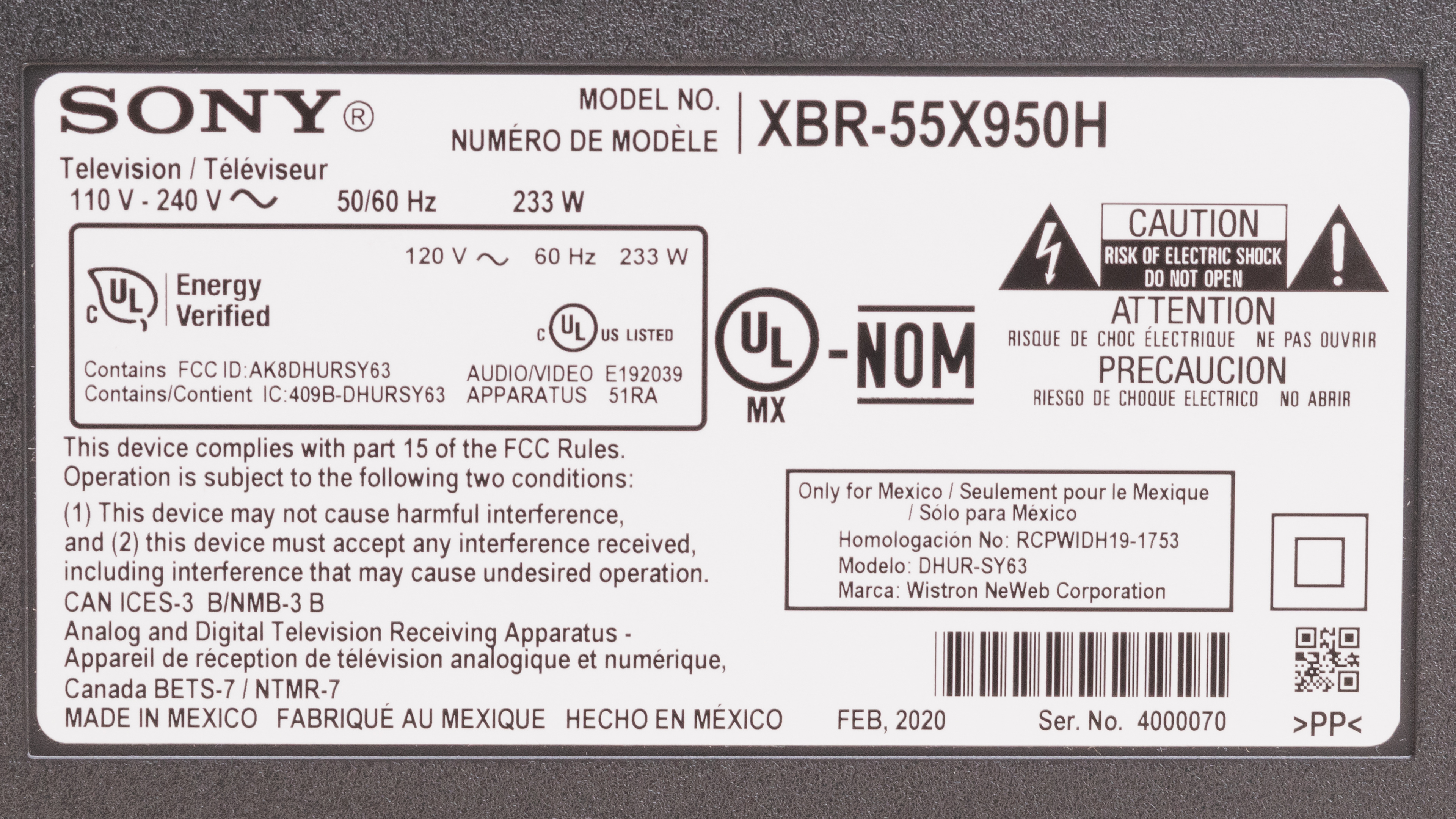 Our unit of the Sony X950H was manufactured in February 2020, you can see the label here.