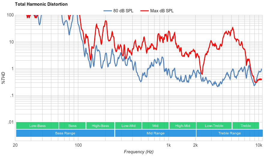 Very poor distortion performance. THD levels are relatively high at most volumes, but they get especially bad at higher levels.
