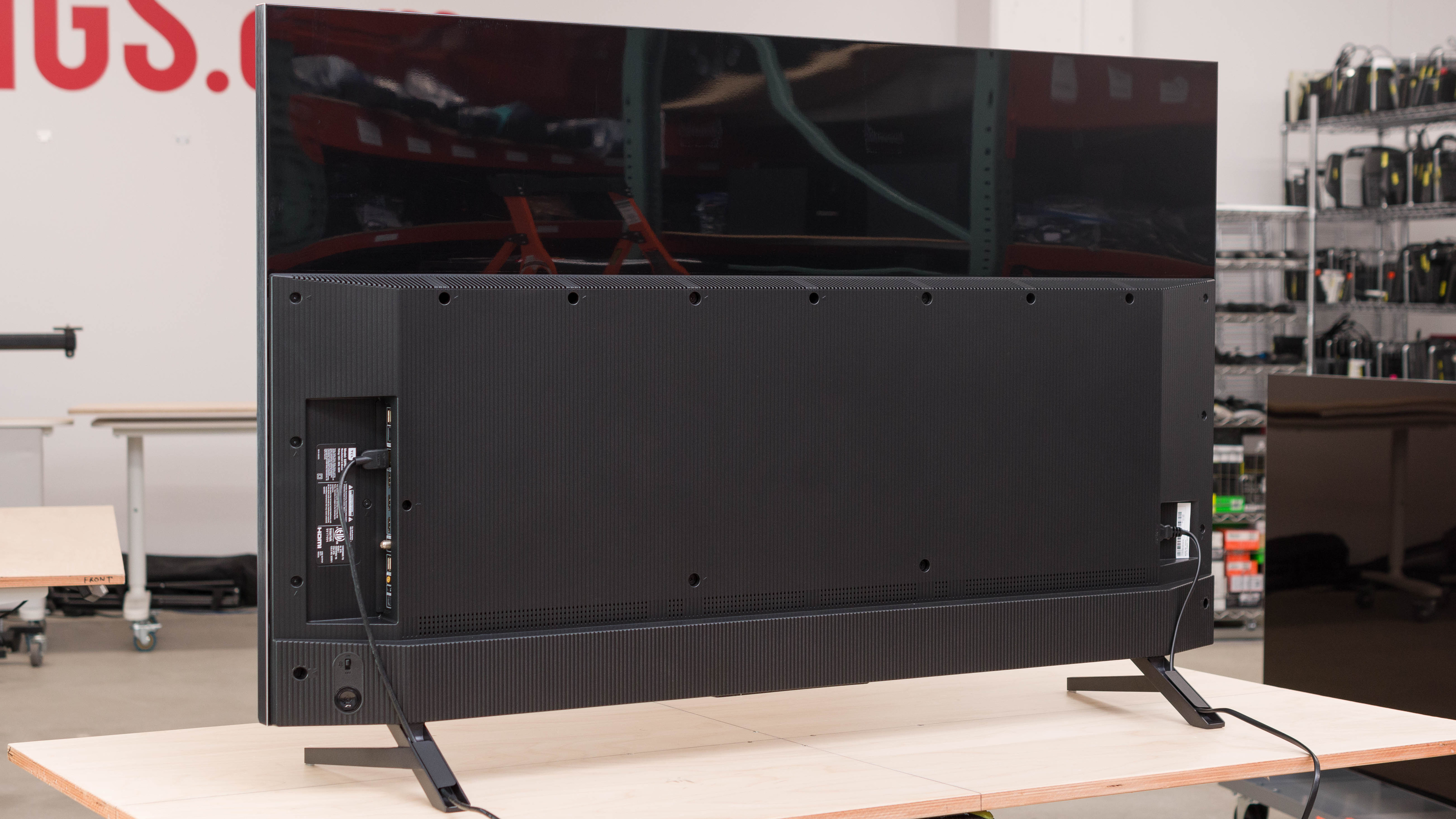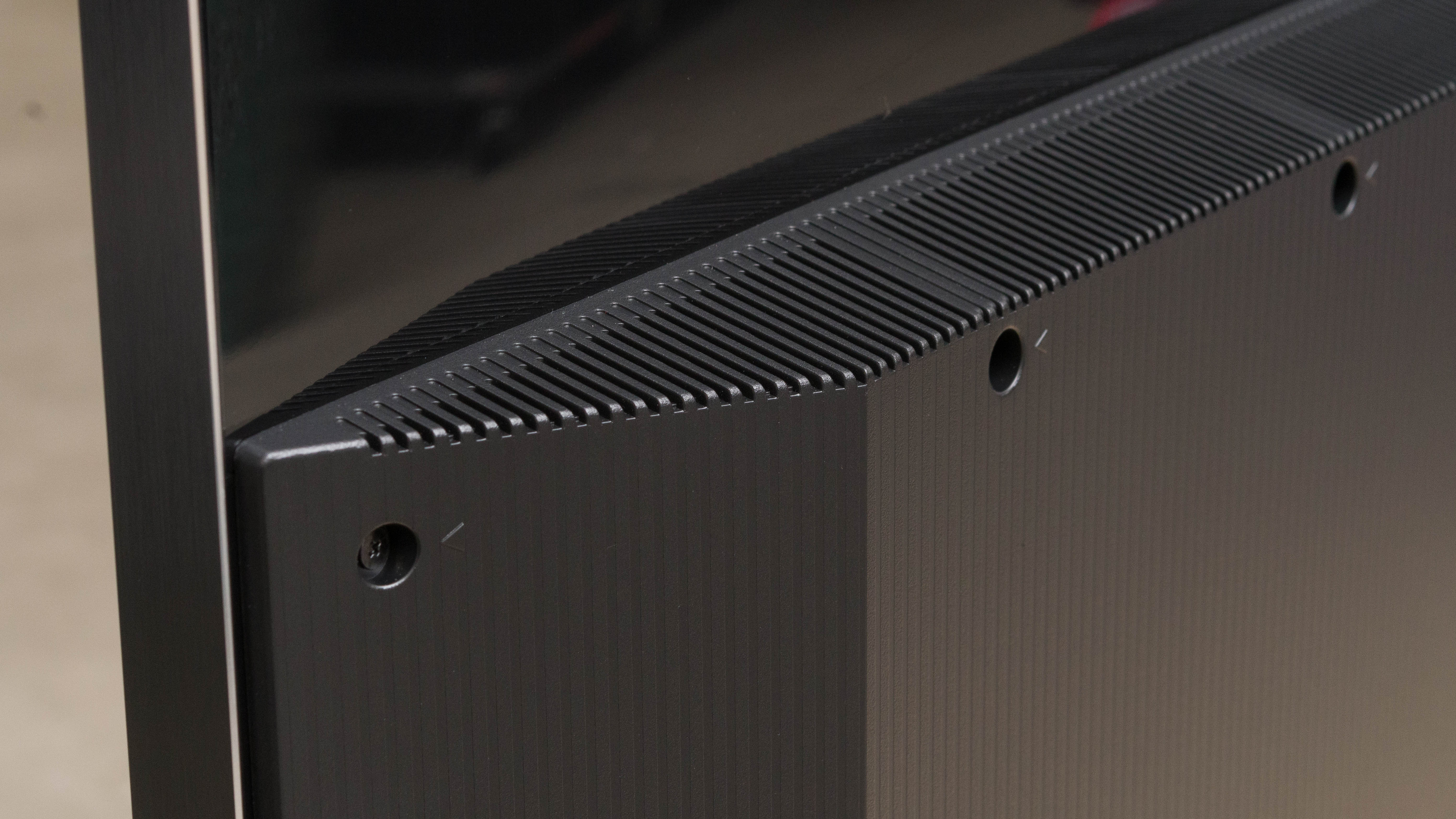 The back is entirely plastic, with a glossy top portion that attracts fingerprints easily and a textured bottom half that houses the TV's electronics and inputs. The inputs face to the side, and they're close to one side of the TV, so they're easily accessible even when the TV is wall mounted. There are vents on top of the textured section for airflow. Each of the feet have flaps that you can use for cable management.