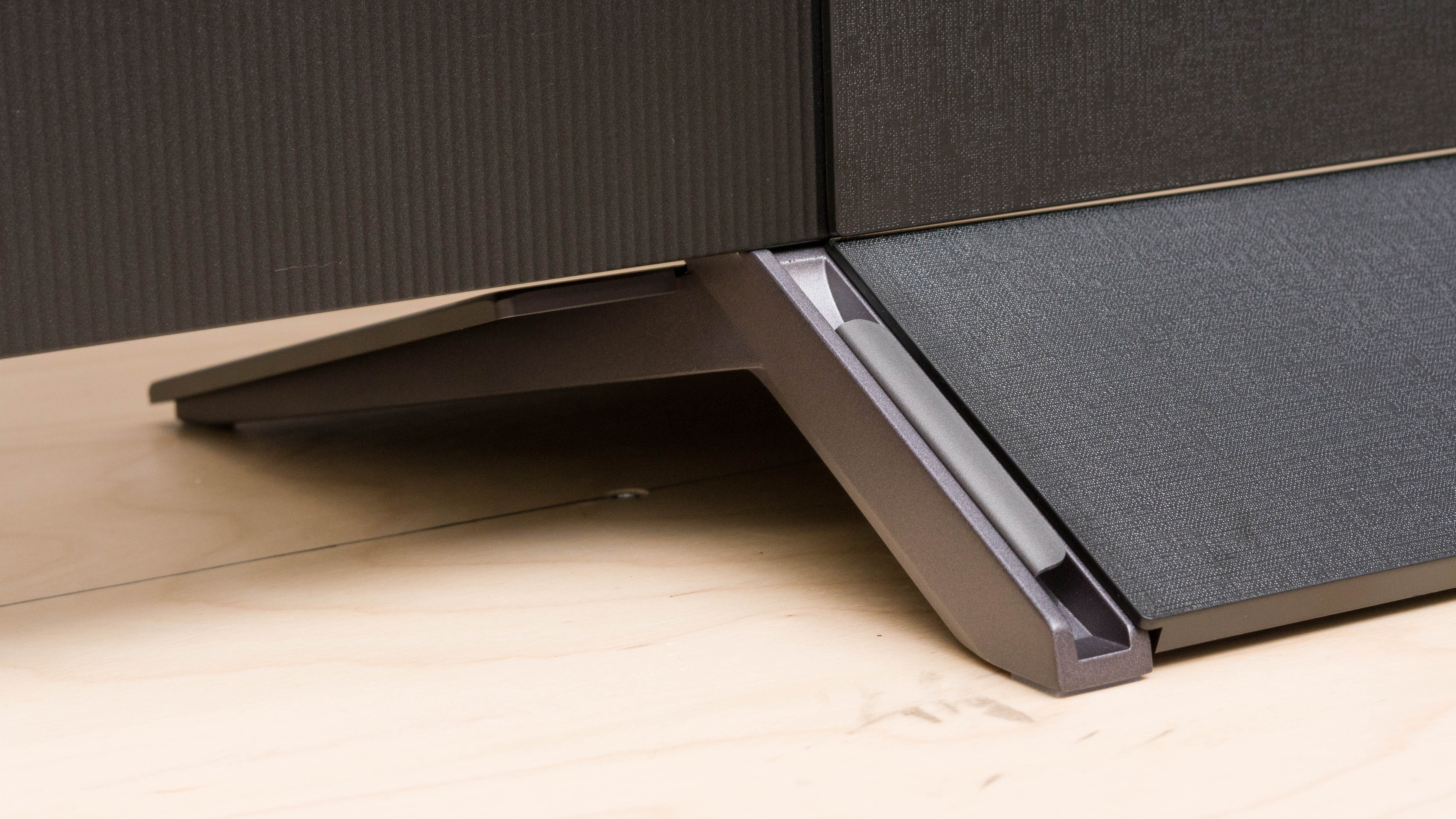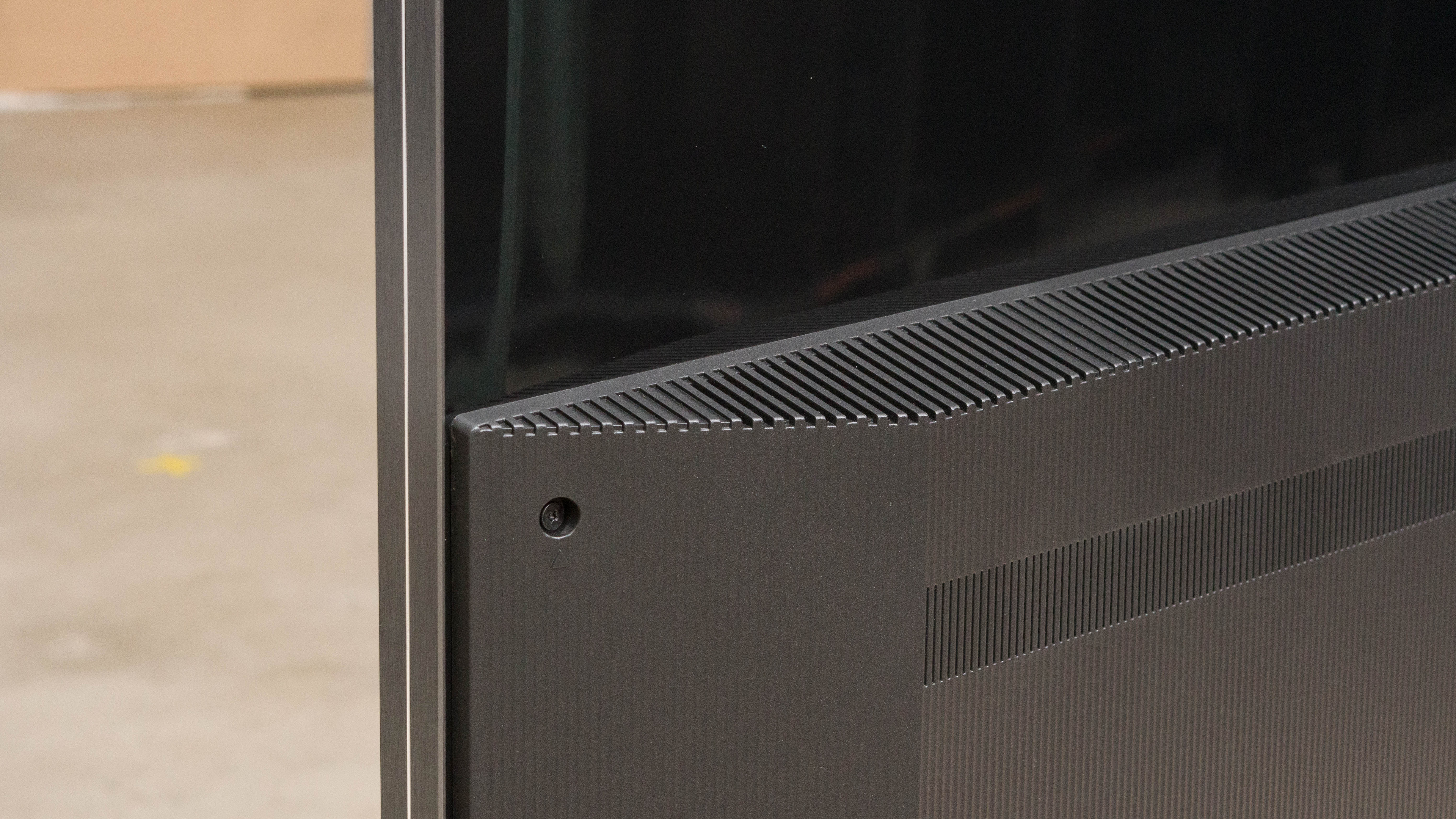 The back of the TCL R648 is different than most. The top part is glossy plastic that feels good, and the bottom part is generic plastic with etched vertical lines, but it feels a bit cheap. The middle part houses the subwoofer, and that's brushed plastic. There are tracks in the back of the stand that you can use for cable management, but you lose those tracks if you wall-mount the TV.