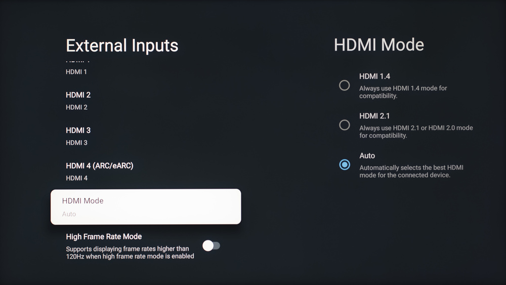 For HDR gaming, it's important to make sure that HDMI Mode is set to 'HDMI 2.1' for the input you're using.