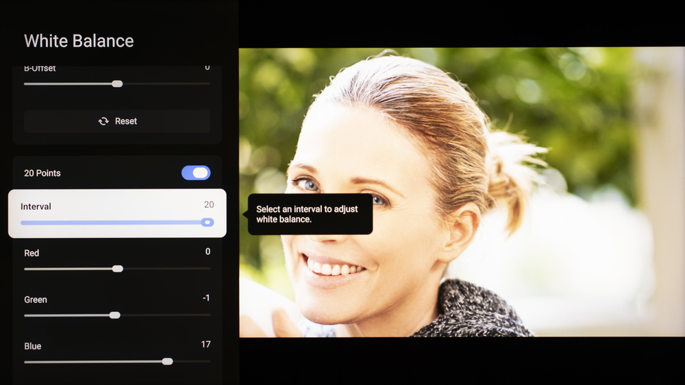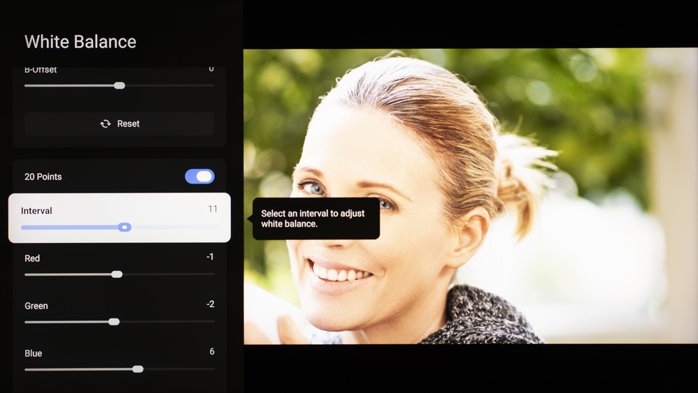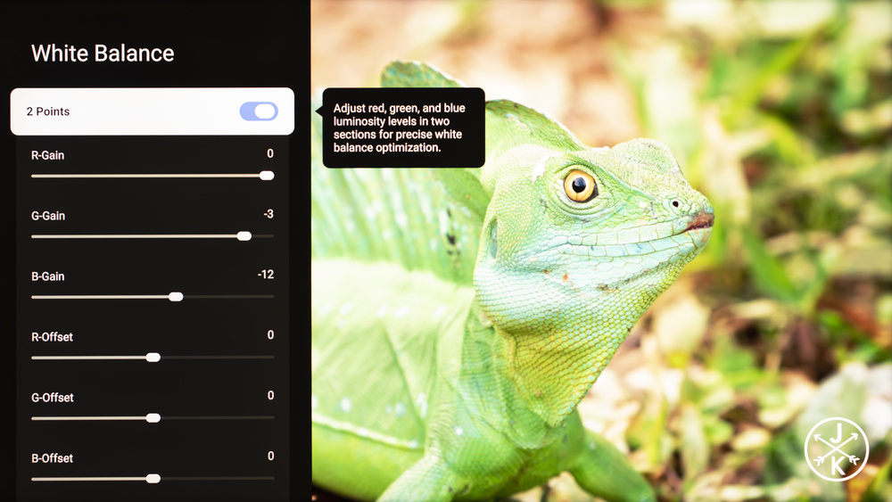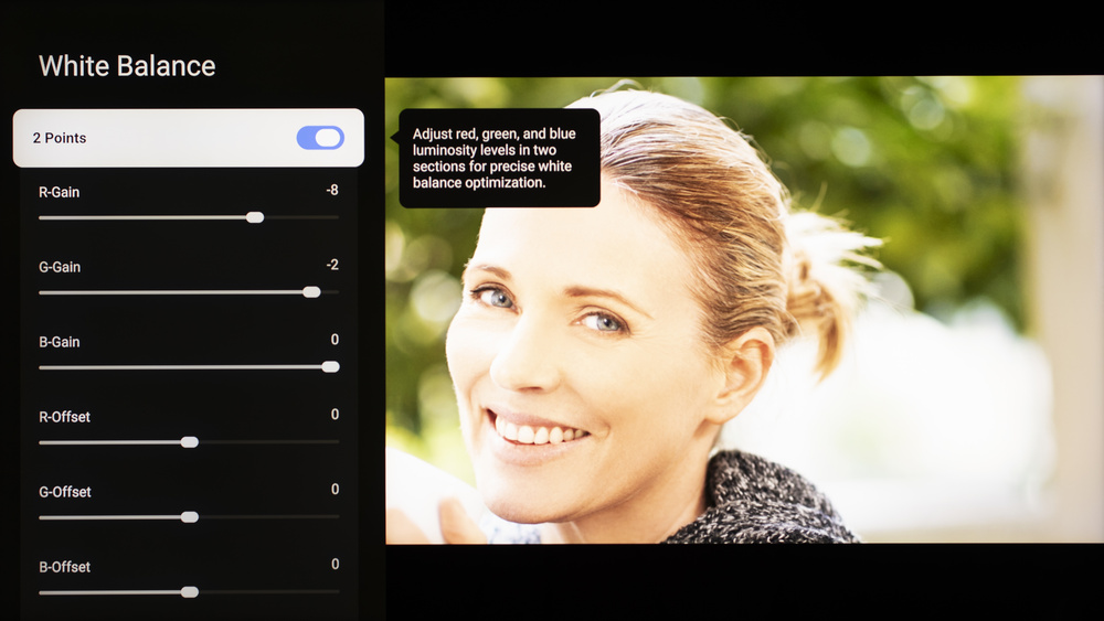 The following are the results of the white balance and colorspace calibration in SDR on our unit. They are provided for reference and should not be copied, as the calibration values vary per individual unit, even for the same model and size as the TV we reviewed, due to manufacturing tolerances. If you want to try them, you will need to enter all the values shown, as all of them are active at the same time. If you end up with worse picture quality, simply reset them to the default values.