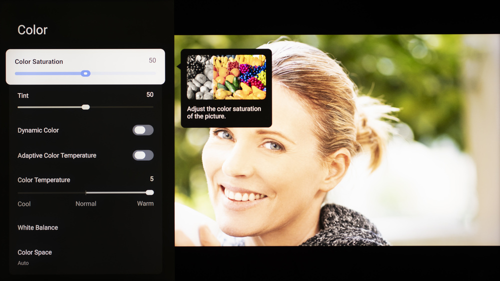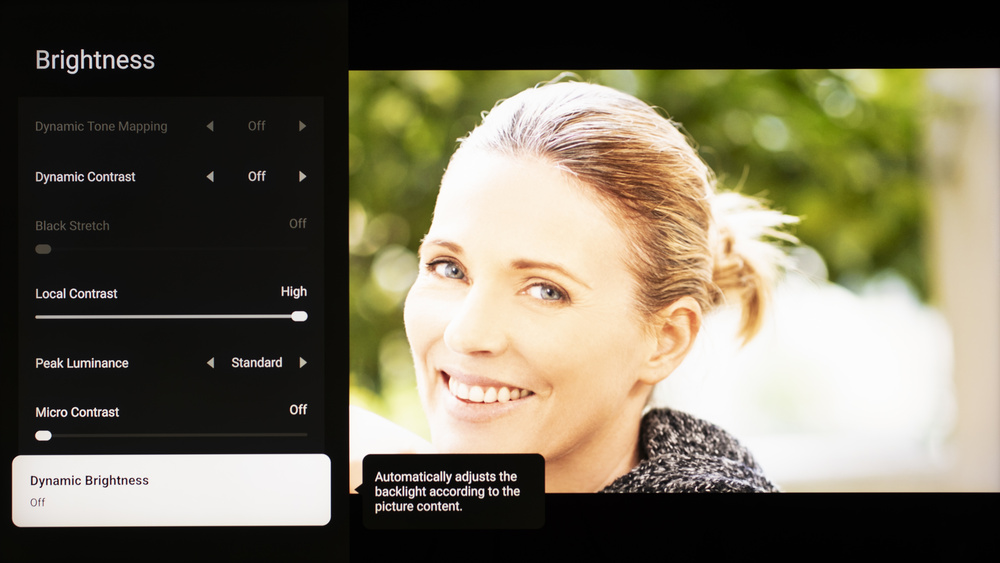 The TV supports HDR10+ and Dolby Vision from native apps and external devices. As with normal HDR content, when you start playing HDR10+ or Dolby Vision content, some settings change automatically. Since we don't specifically test these formats, we don't have exact settings for them, but they should be the same as our HDR10 settings.
