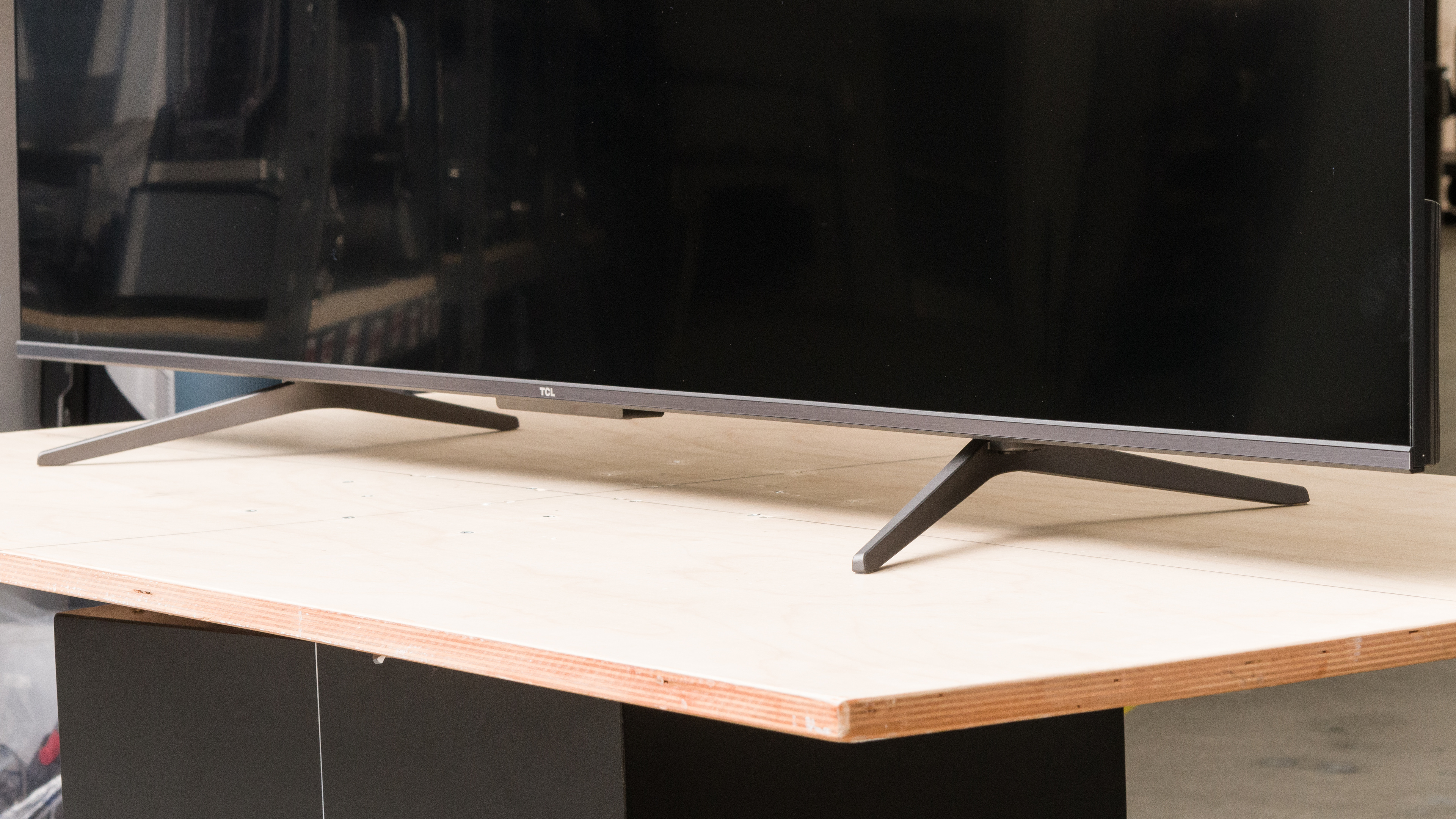 The TCL 65Q650G has a set of plastic feet, which you can place at two distinct positions. The first position, pictured above, sets the feet in a wider position and has a footprint of 53.8" x 14.1". The narrow position puts the feet closer to the TV's center and lets you put the TV on smaller tables. In this position, the feet have a footprint of 36.9" x 14.1". The screen sits about 2.7 inches from the table, so some slimmer soundbars fit under it, but it's a tight fit. In the narrow position, the protruding feet get in the way of putting a soundbar directly in front. Note that the 75 and 85-inch models have different feet than the 65-inch model.
