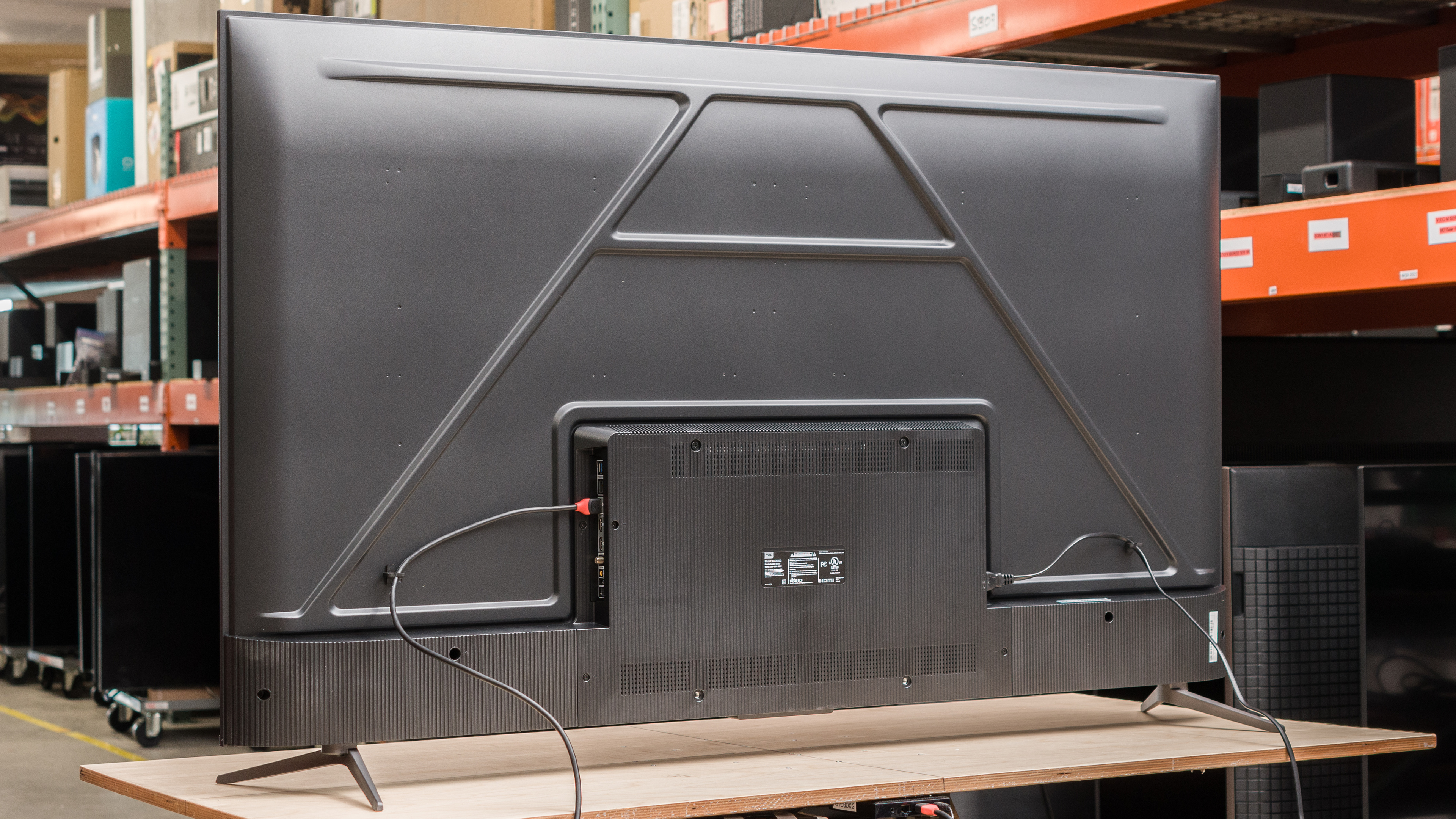The back of the TV is a mix of metal and plastic. The TV's back has two distinct parts: the plastic bottom part, which protrudes from the back and hosts the inputs and power connection, and the thinner metallic upper portion. The metal is rigid and untextured, while the thick textured plastic on the bottom part has a lot of flex to it when you press on it. That said, it isn't worrying and feels normal for a budget TV.