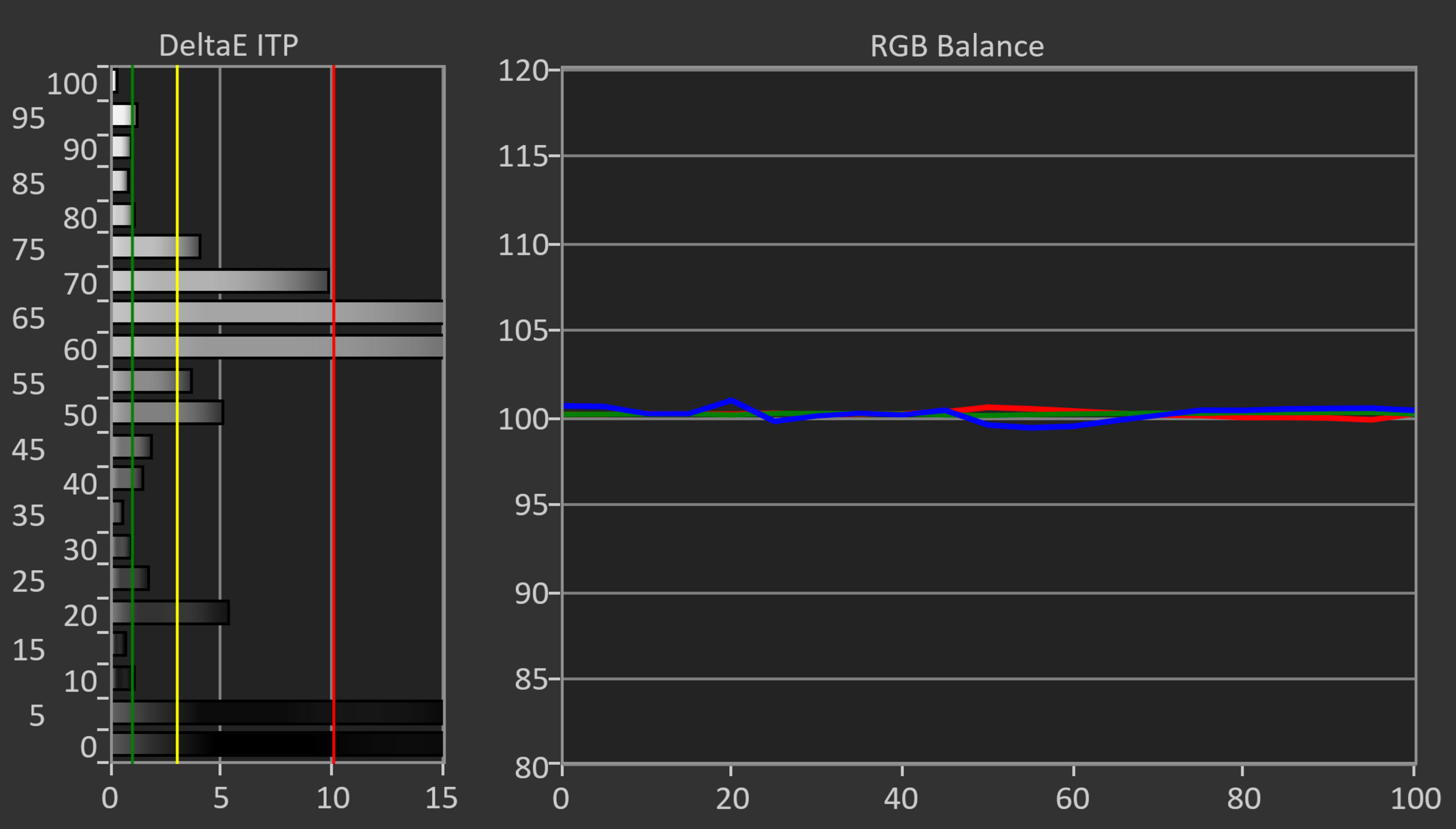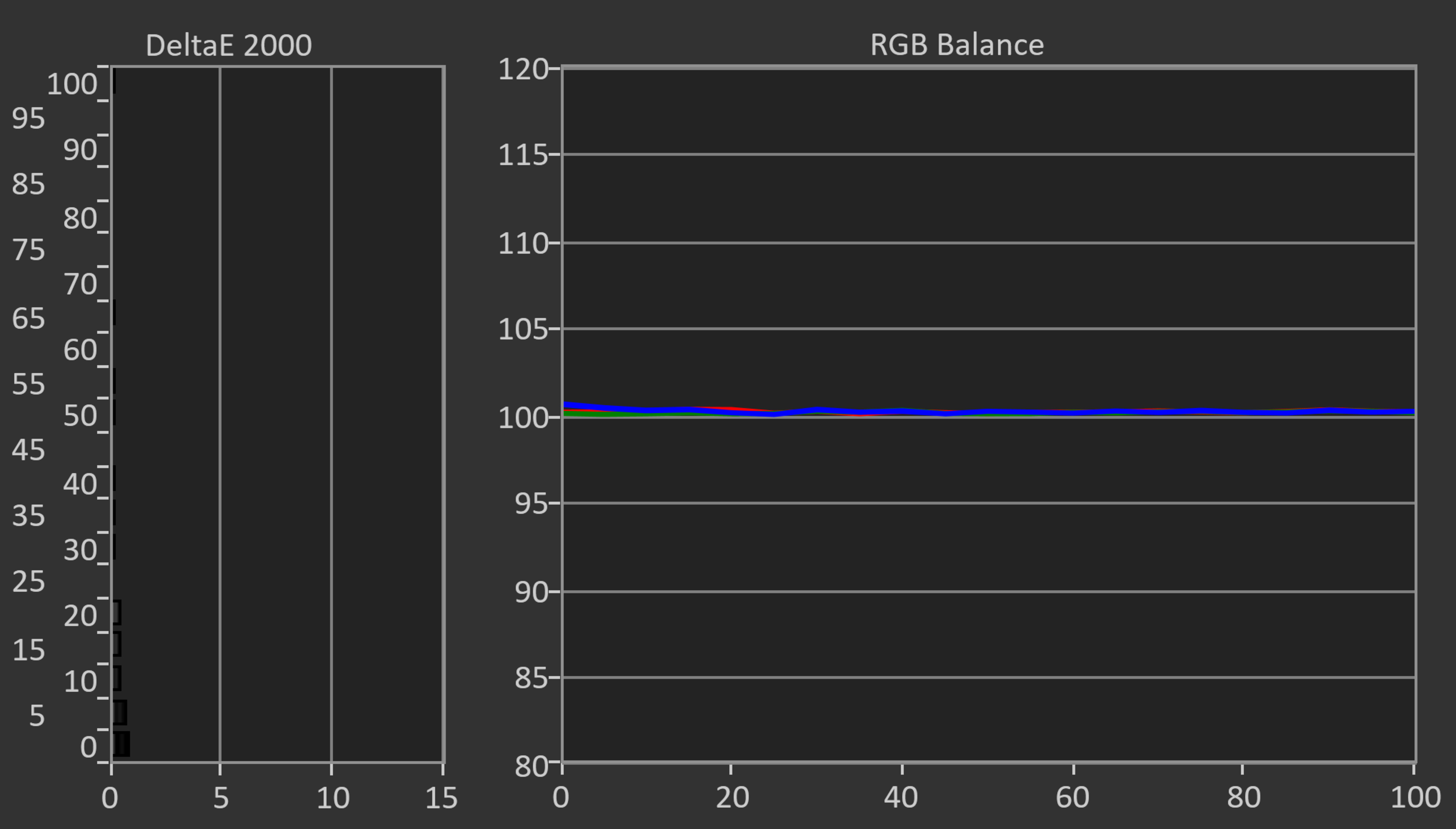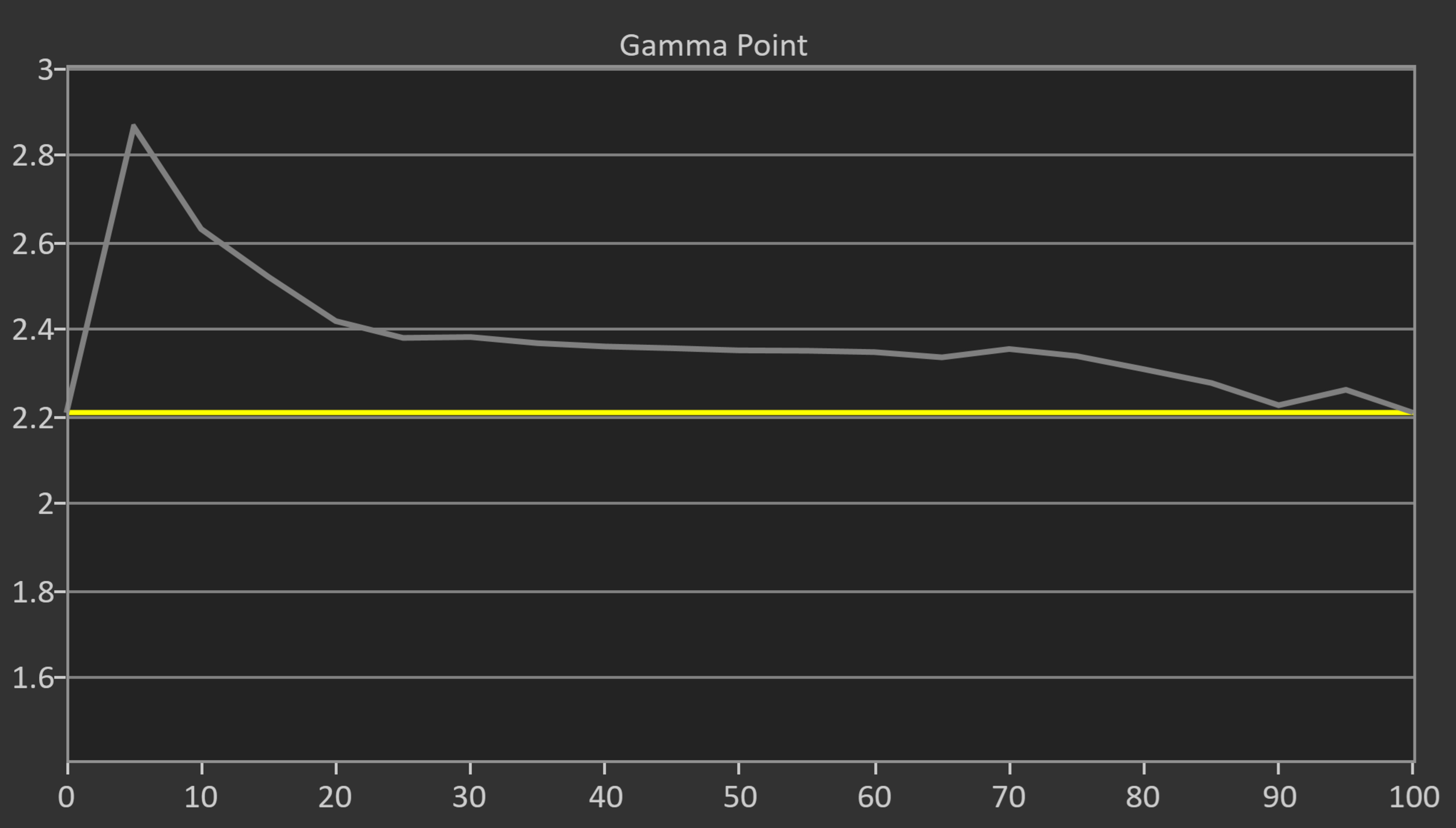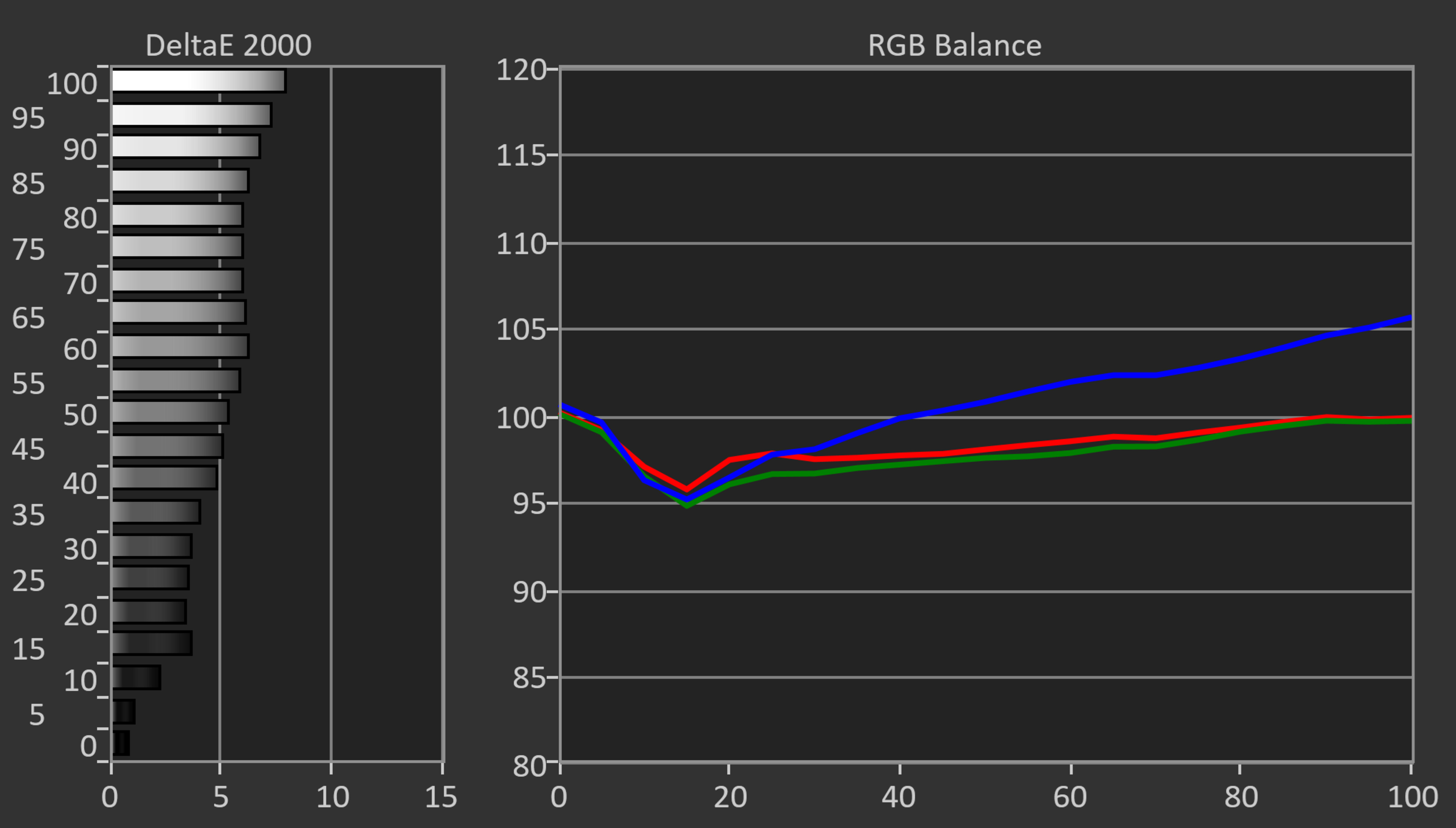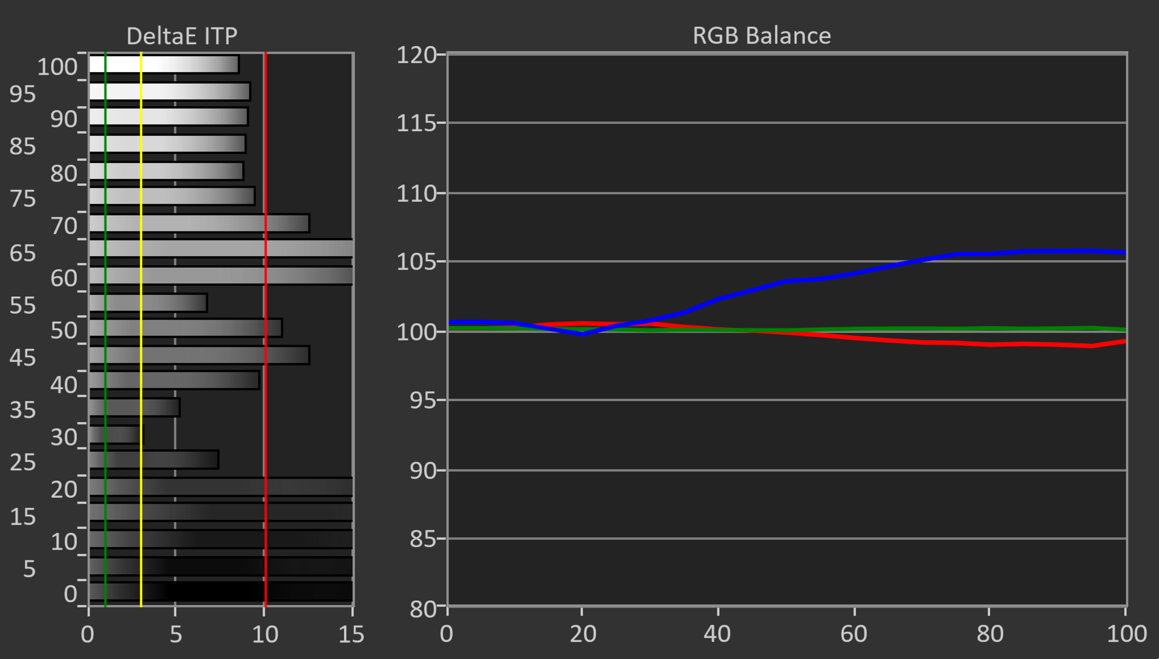 This TV has okay accuracy in HDR before calibration. The white balance is okay, with midtones and shadow details showing the biggest issues, and the color temperature is very cool. The color accuracy is poor, though, with significant mapping errors across all colors.
