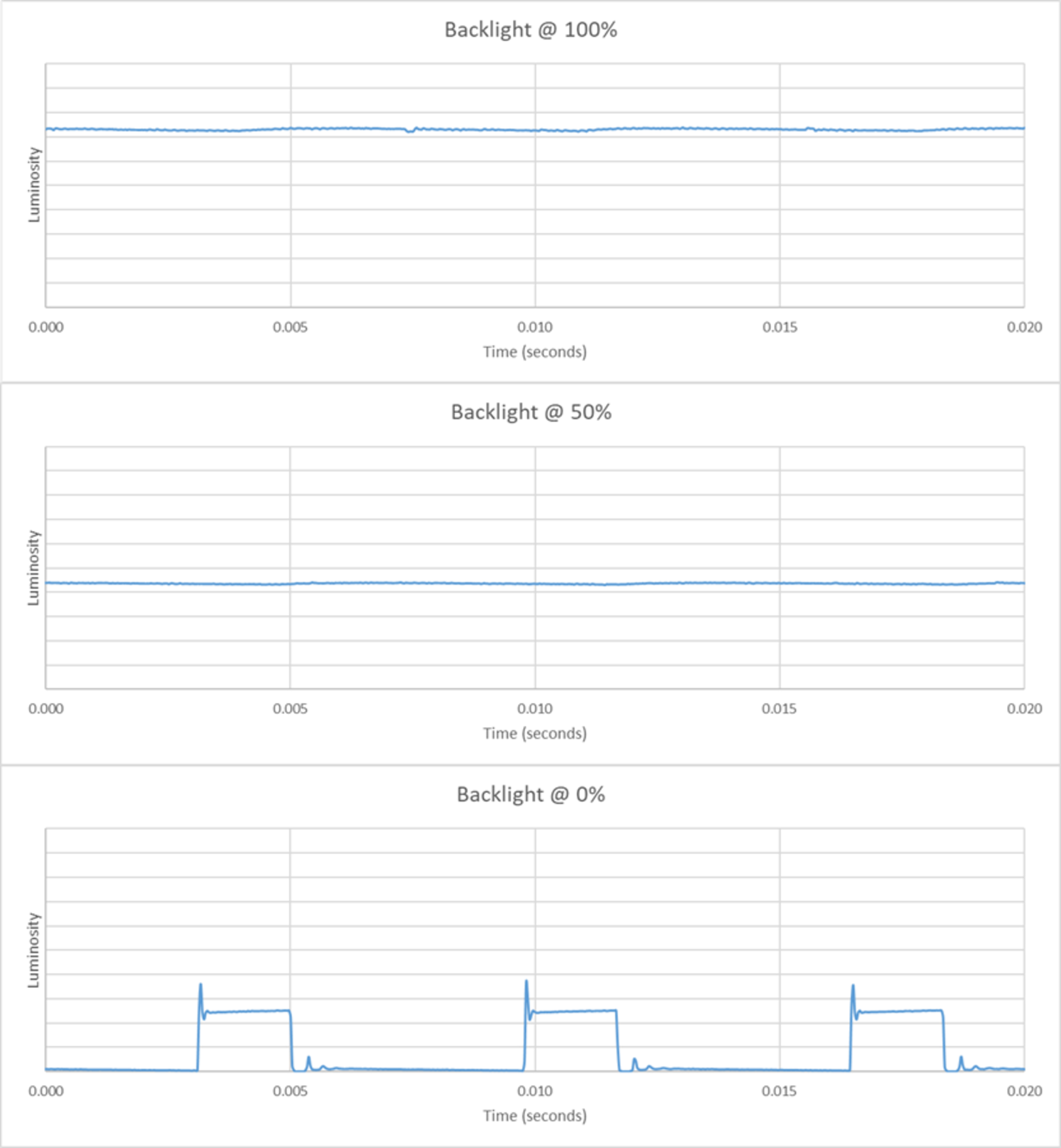 This TV uses a combination of pulse width modulation (PWM) and direct DC dimming to adjust the backlight intensity. Between a setting of 0 and 28, it uses PWM at a low frequency, which can bother some people. It also doesn't flicker at an even multiple of 60Hz, which causes image duplication. It's flicker-free above 28.