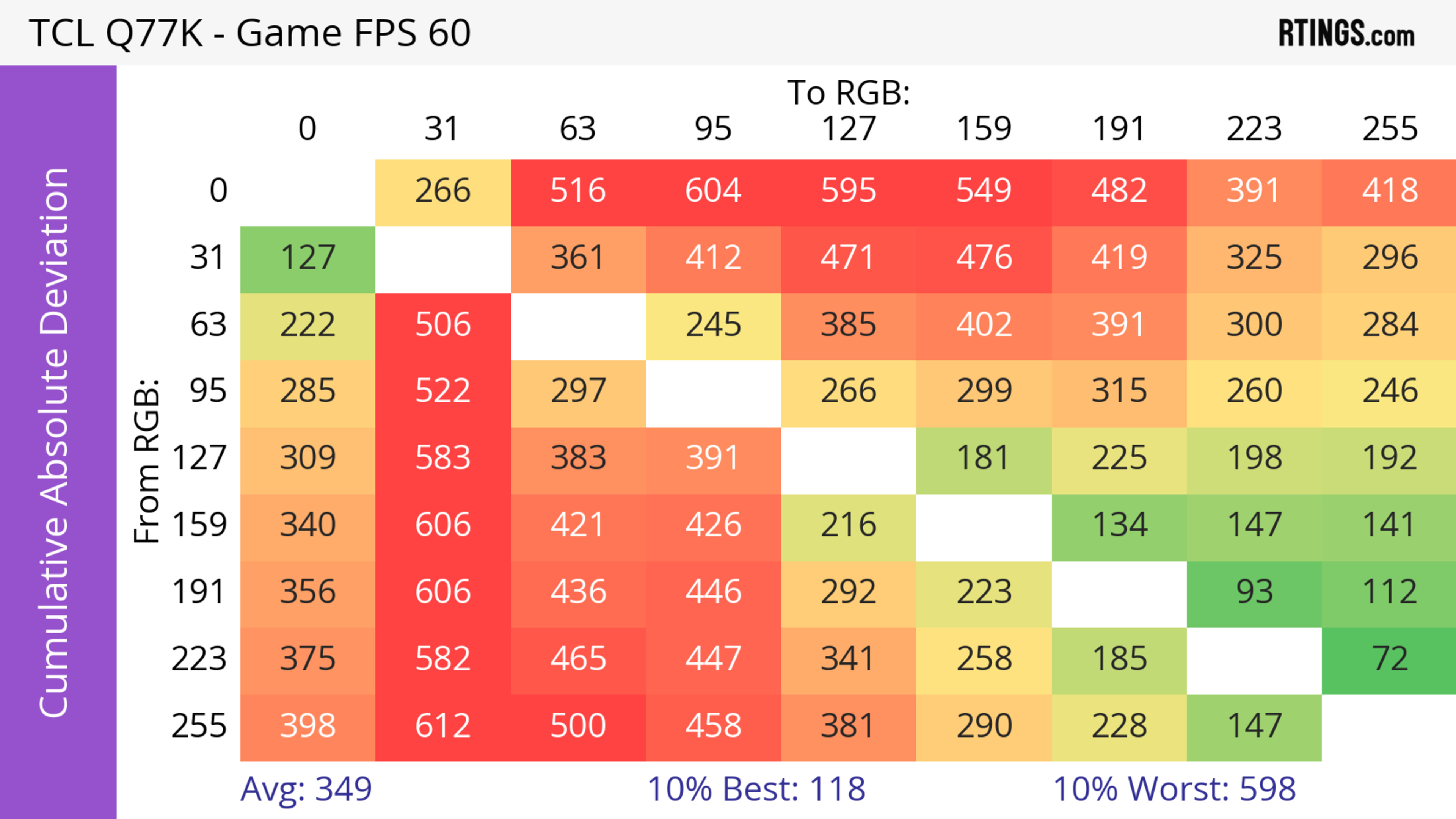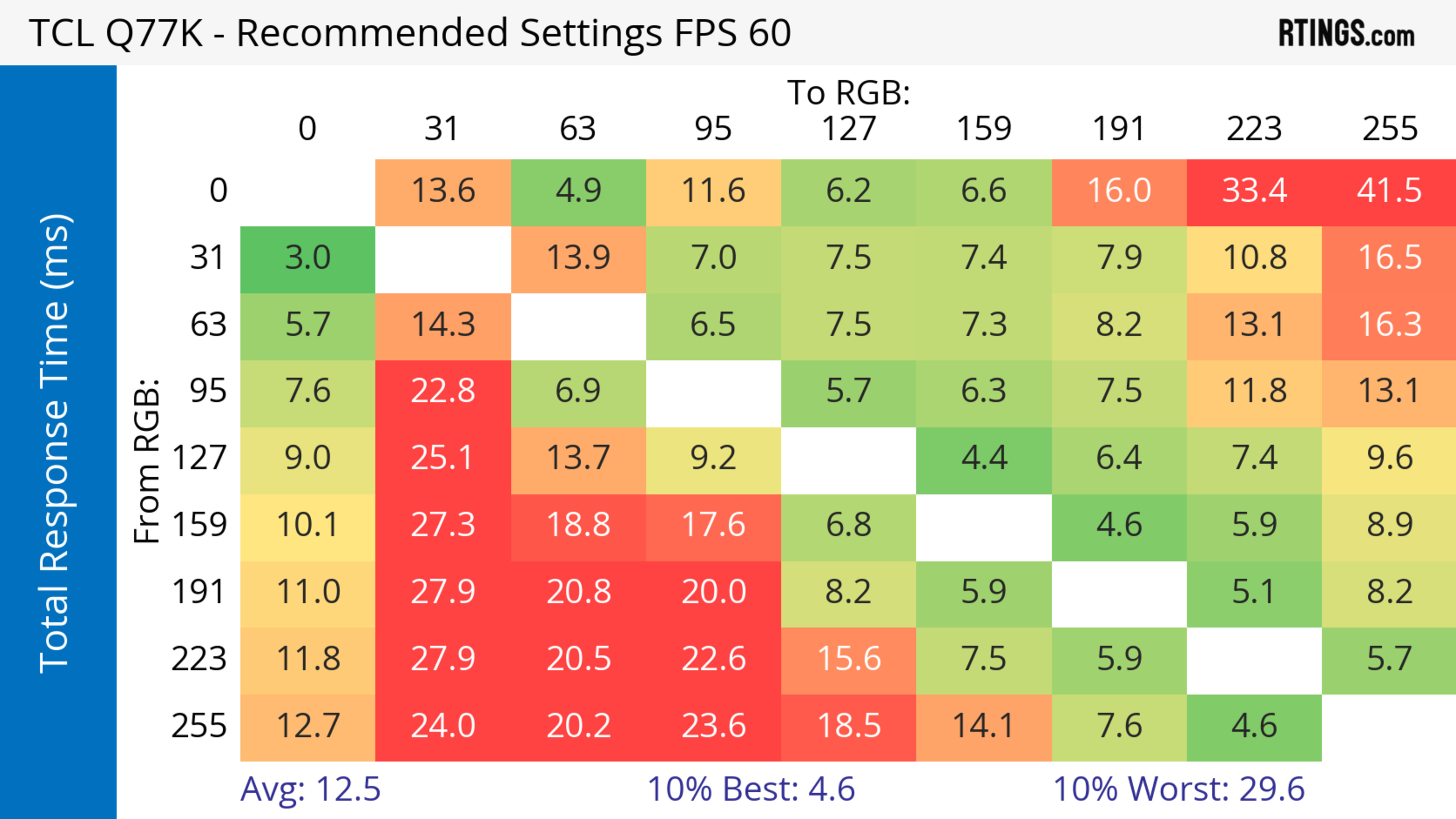 The TCL Q77K is a mediocre TV for gaming. It has an incredible array of gaming features, including its high refresh rate, HDMI 2.1 support, and VRR, and it feels responsive overall thanks to its incredibly low input lag. It doesn't deliver very good picture quality, though, and the response time at 60Hz is very slow, resulting in blurry motion. Overall, it's best suited for PC gamers aiming to run it at a very high refresh rate, but only if you care more about responsiveness than picture quality.