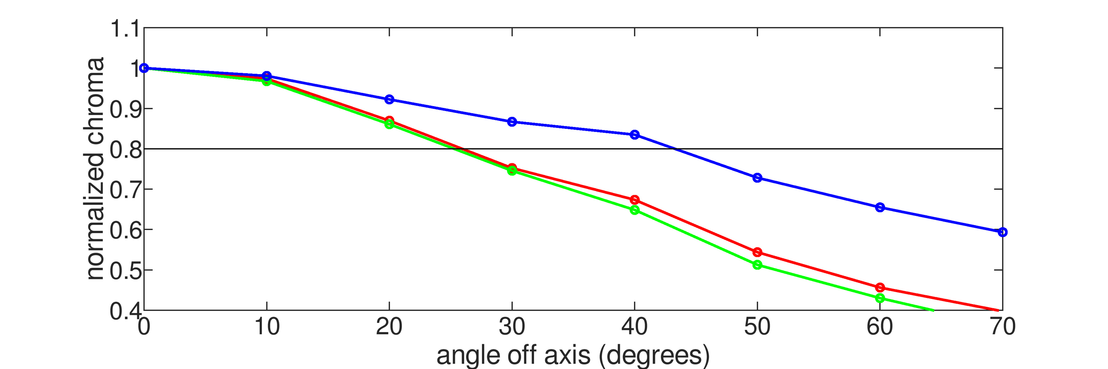 The TV uses a KSF phosphor coating to produce red light, with high peaks on reds and blues. This model does have good separation between colors.