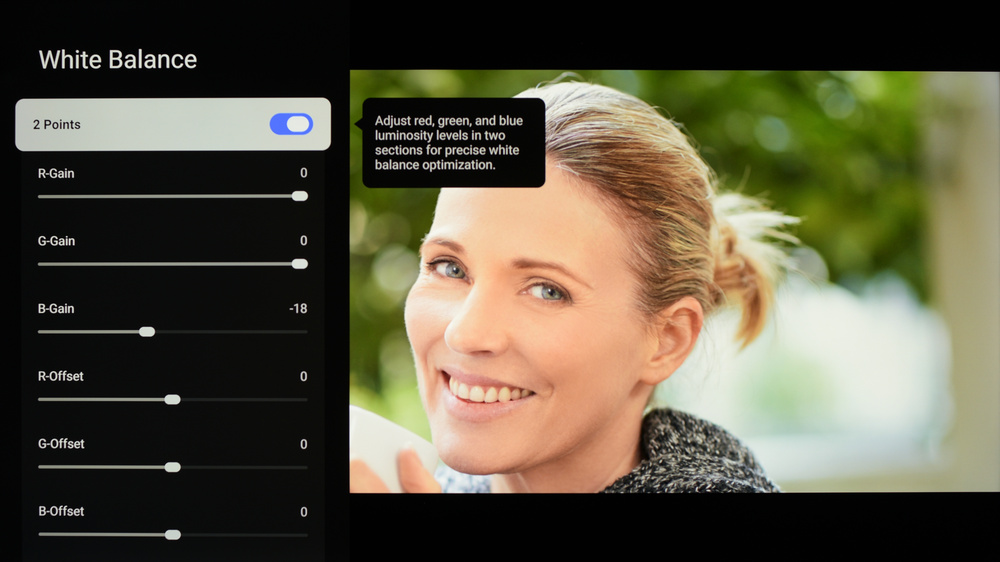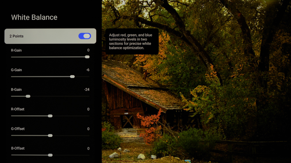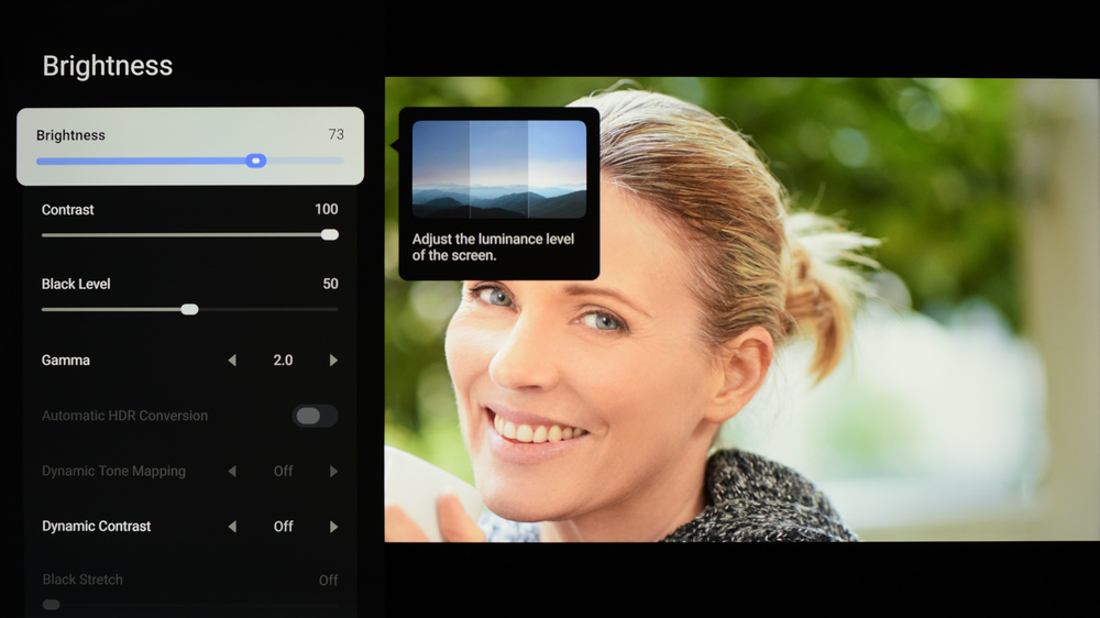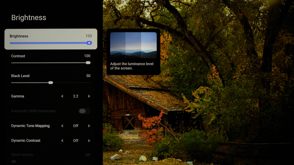The TV supports HDR10+ and Dolby Vision from native apps and external devices. As with normal HDR content, when you start playing HDR10+ or Dolby Vision content, some settings change automatically. Since we don't specifically test these formats, we don't have exact settings for them, but they should be the same as our HDR10 settings.
