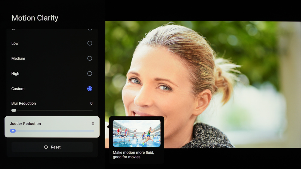 This TV automatically removes judder from 24p sources and from the internal apps. To remove judder from 60Hz sources without interpolation, enable the Motion Clarity setting and set both Blur Reduction and Judder Reduction to '0.'