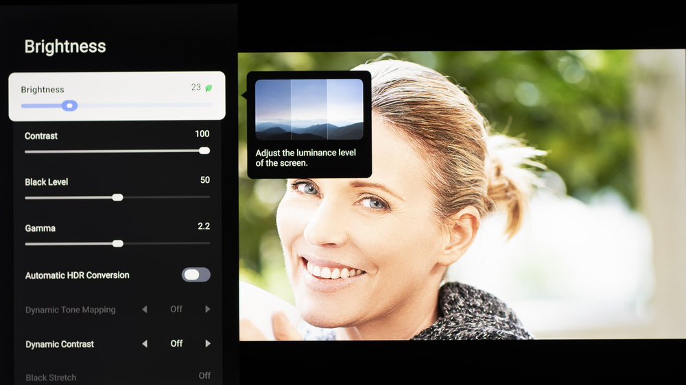 The TV supports HDR10+ and Dolby Vision from native apps and external devices. As with normal HDR content, when you start playing HDR10+ or Dolby Vision content, some settings change automatically. Since we don't specifically test these formats, we don't have exact settings for them, but they should be the same as our HDR10 settings.
