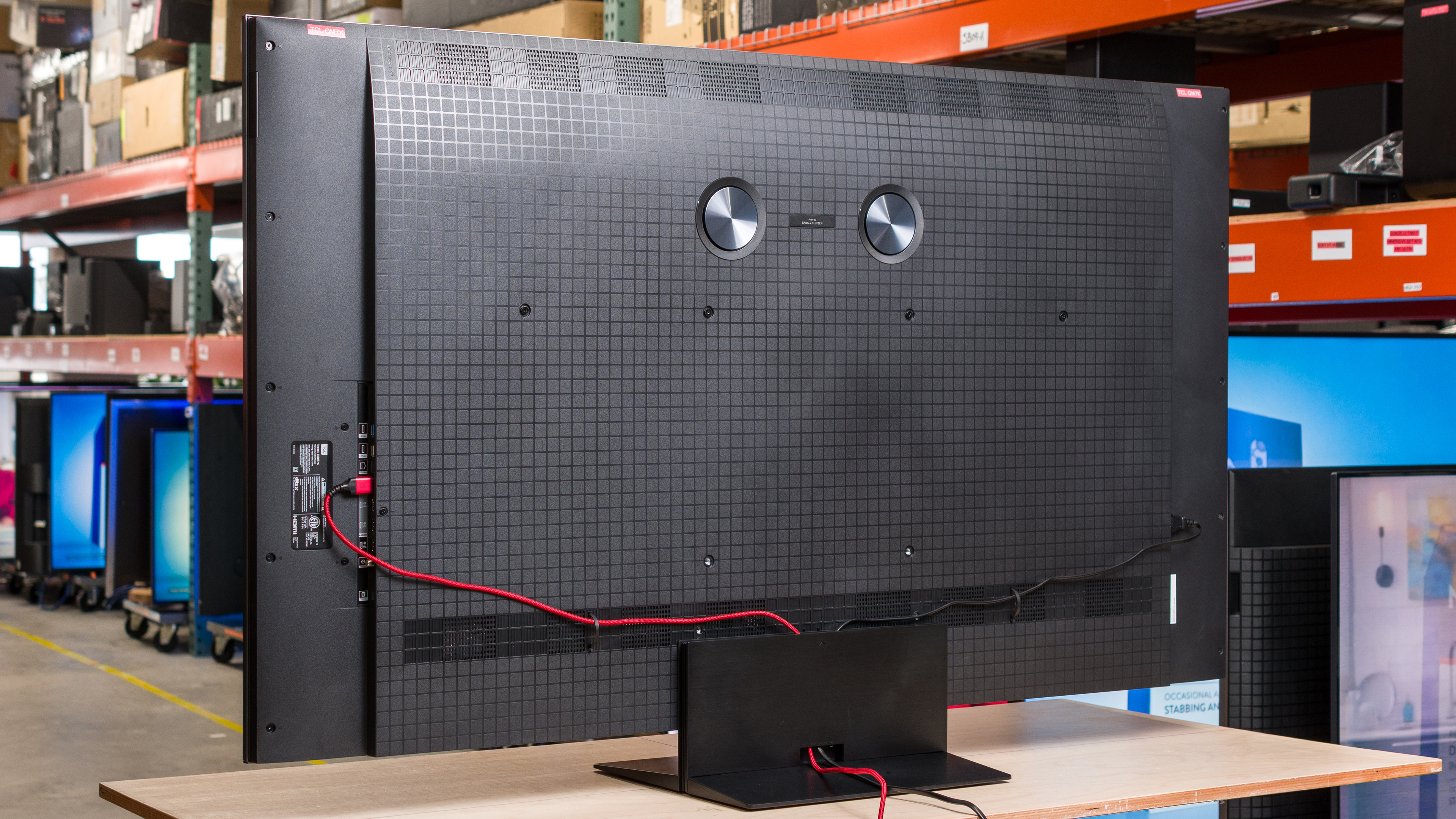 The back of the TV is made of plastic, with a grid-like pattern. All of the inputs except for the power connector are located on the right side of the TV when facing the front, and they're easy to access if you have the TV wall-mounted. The TV has clips on the back for cable management.