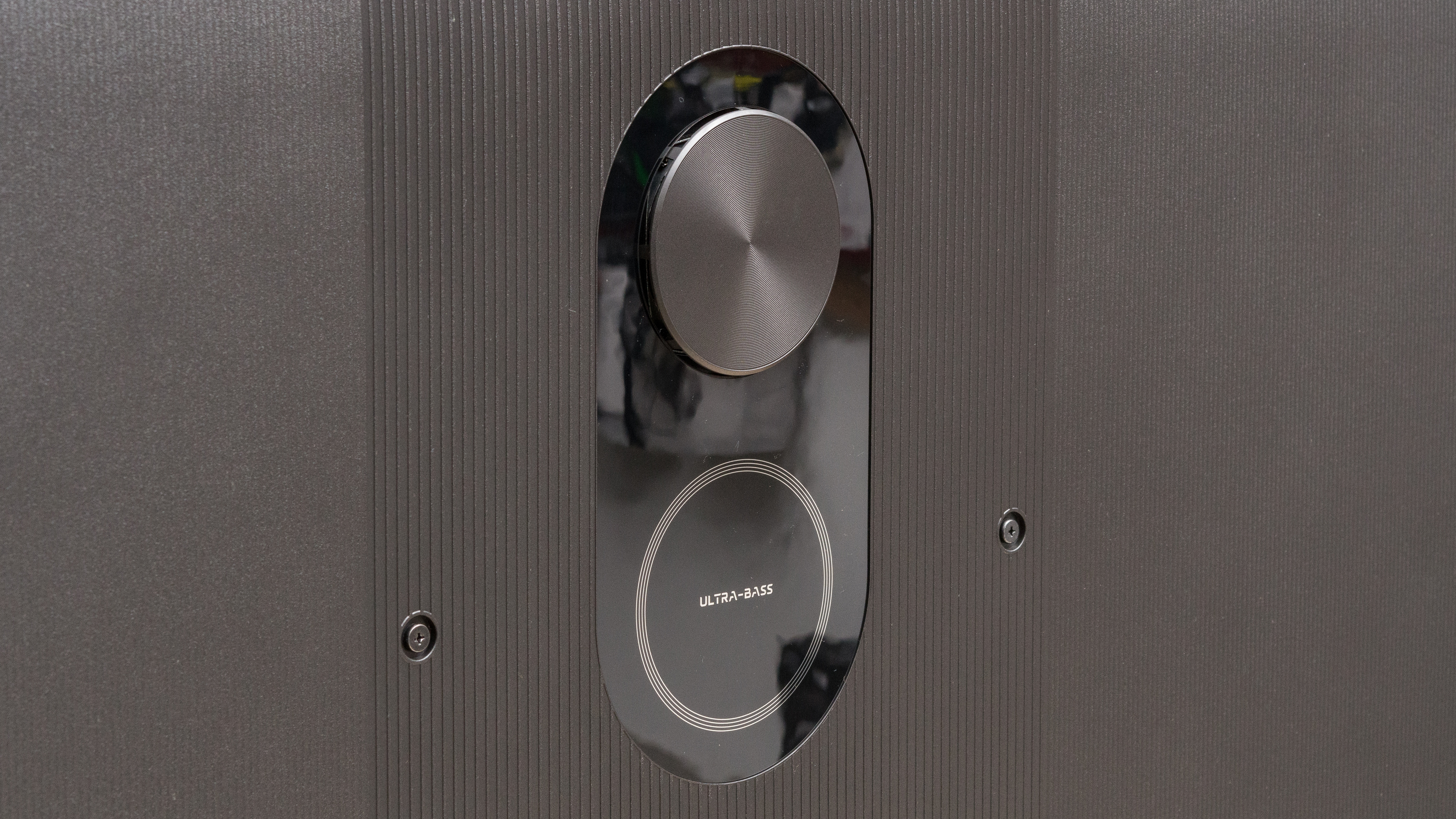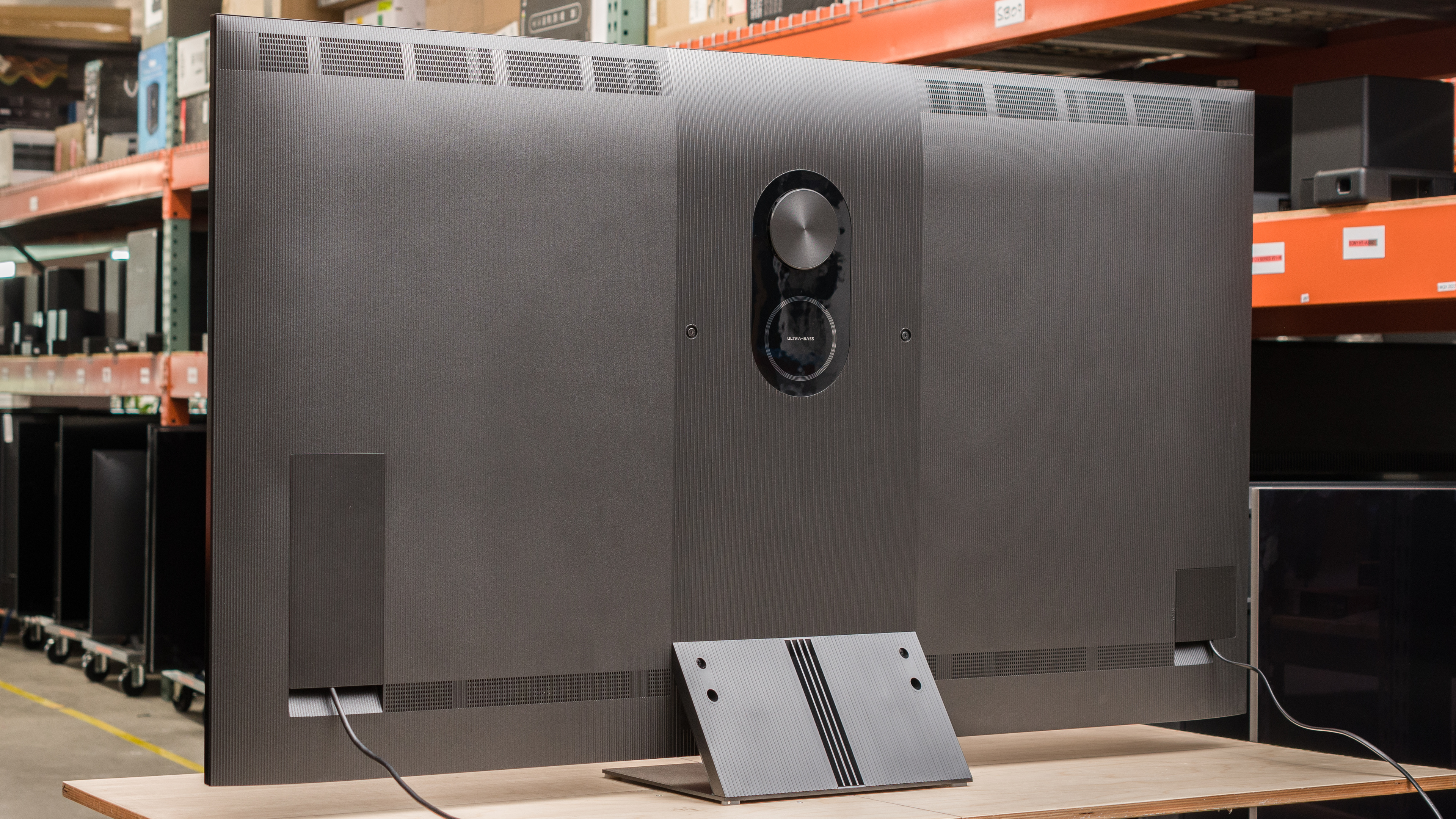 The back of the TV is entirely plastic, with a nice textured feel. The TV's integrated subwoofer is visible and gives the back a unique look. The inputs are on the left side of the TV, and the power cord on the right, and both can be hidden behind included panel covers. The inputs are a bit hard to access when the TV is wall-mounted.