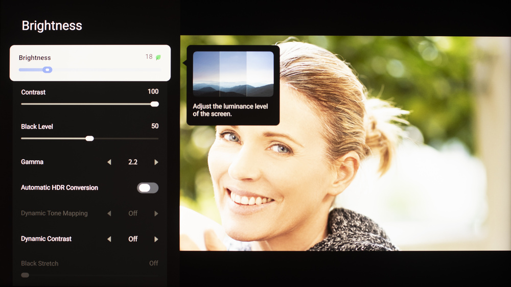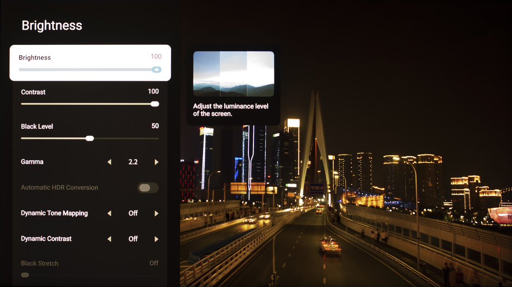 The TV supports HDR10+ and Dolby Vision from native apps and external devices. As with normal HDR content, when you start playing HDR10+ or Dolby Vision content, some settings change automatically. Since we don't specifically test these formats, we don't have exact settings for them, but they should be the same as our HDR10 settings.